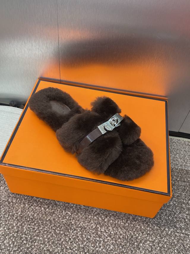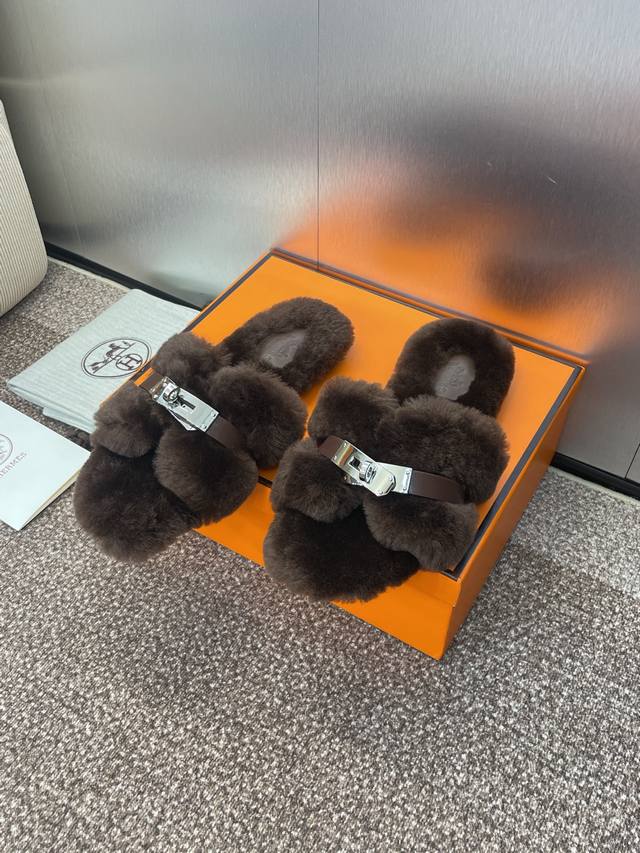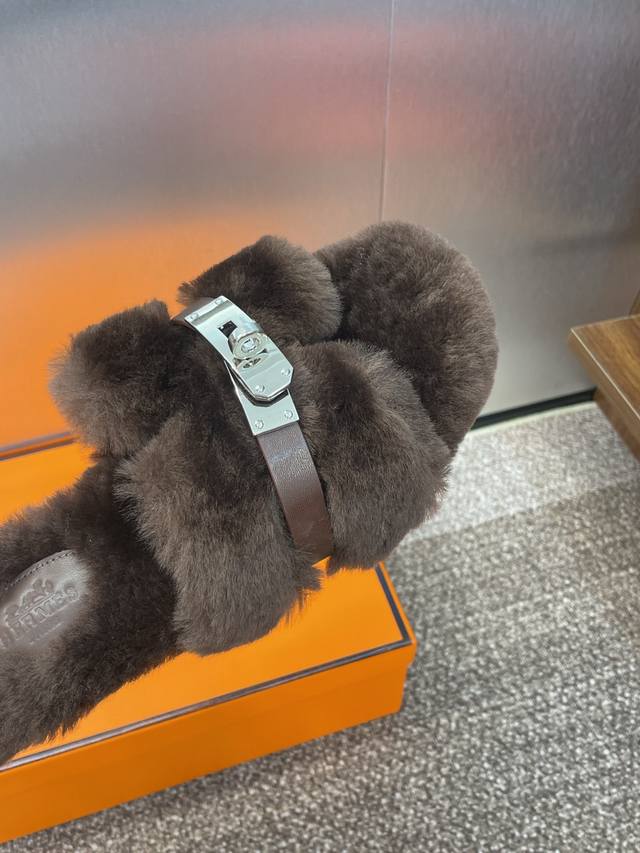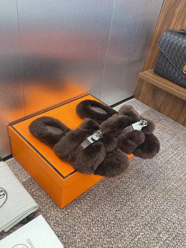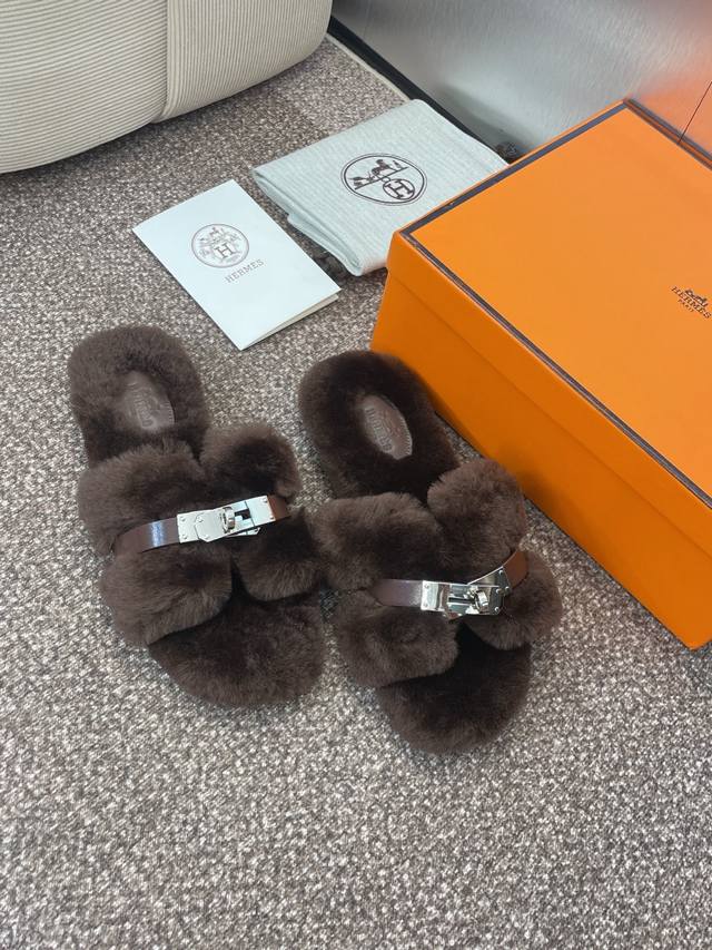 Hermes Fw25 New Arrival~ 爱玛仕秋冬新品H毛拖 皮毛一体拼接羊皮,搭配经典镀钯Kelly扣...