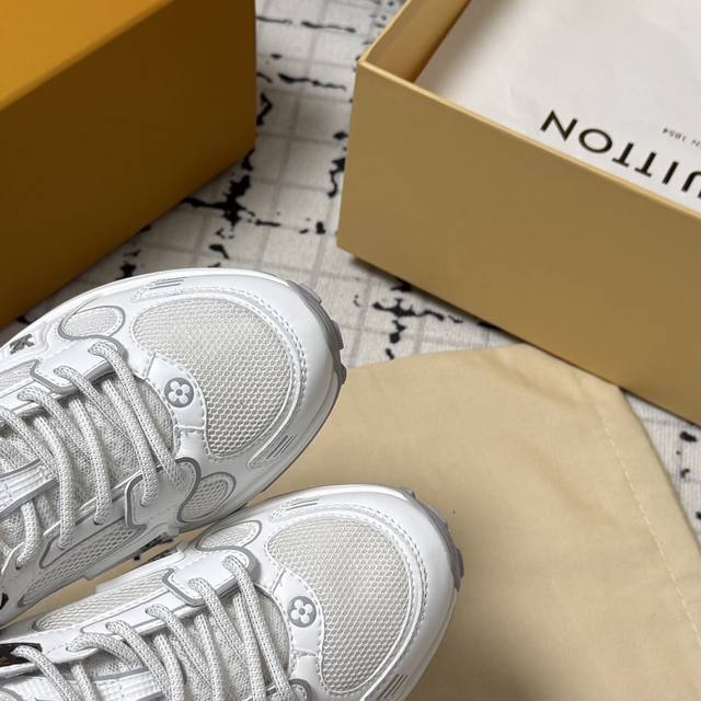 本款 Lv Olympia 运动鞋融合网格面料与金属质感合成皮革等科技面料,以利落简约设计重绎经典跑鞋设计。轻盈 Eva 外底成就舒弹穿着体验。Monogram 压纹与 Lv 字母等丰富细节树立辨识度