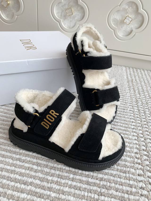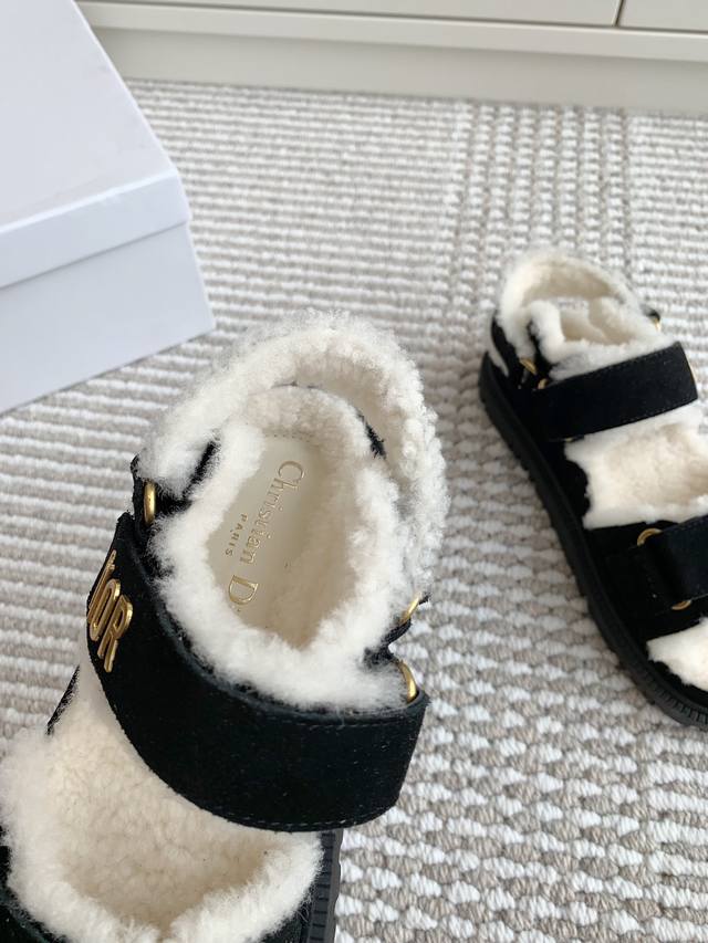 这款 Dioract 凉拖以黑色绒面羊皮革鞋面和白色皮毛一体效果里料重新诠释,打造时尚廓形。贴合脚型的舒适鞋底,搭配魔术贴饰带,鞋面饰带点缀以金色饰面金属 Dior 标志提升格调。可搭配各式造型,彰显摩登风范。