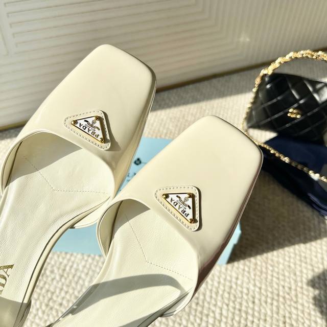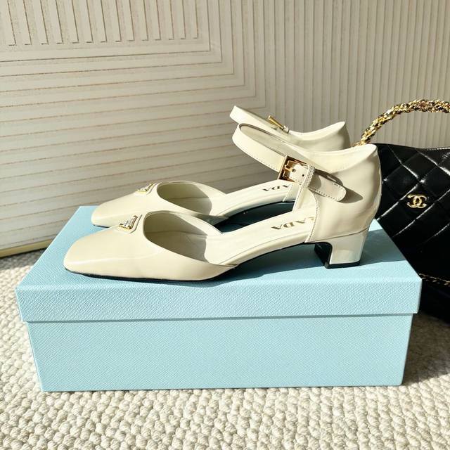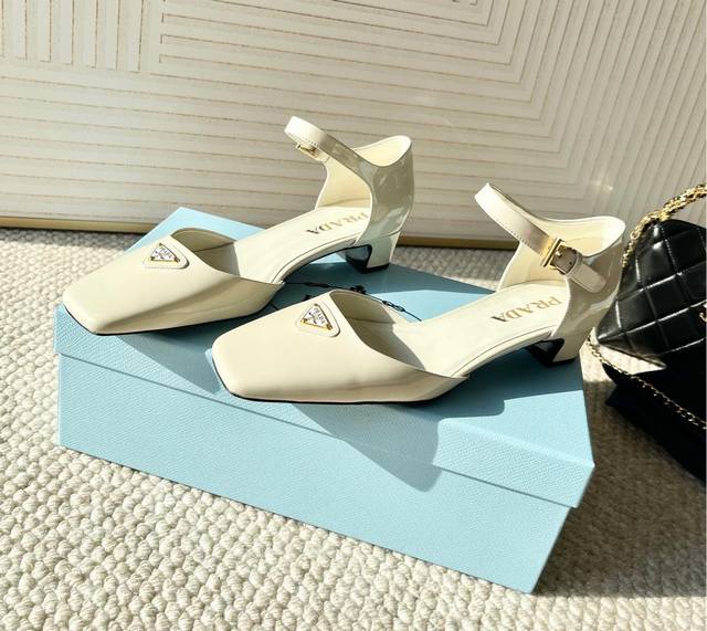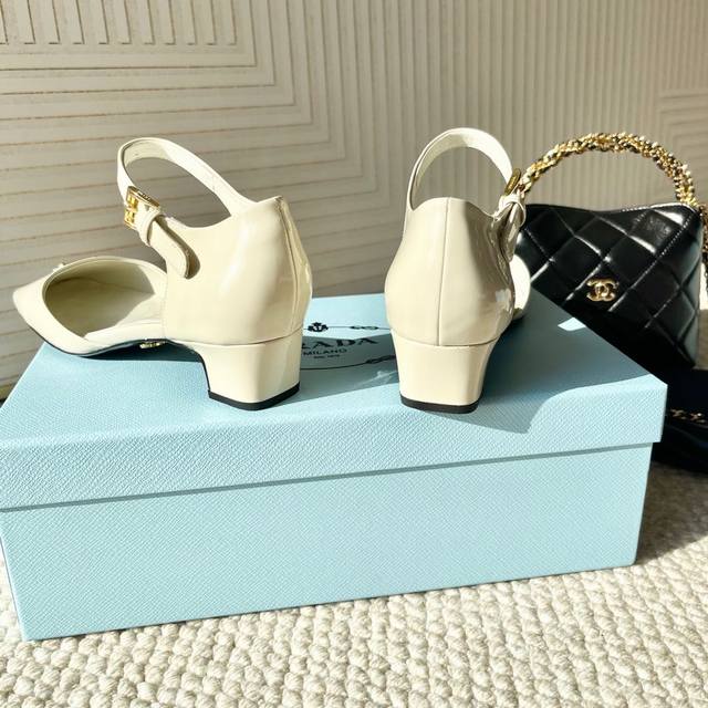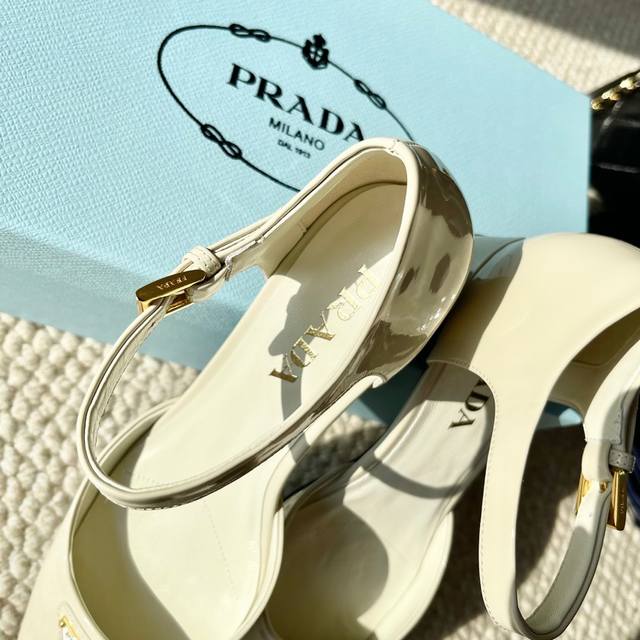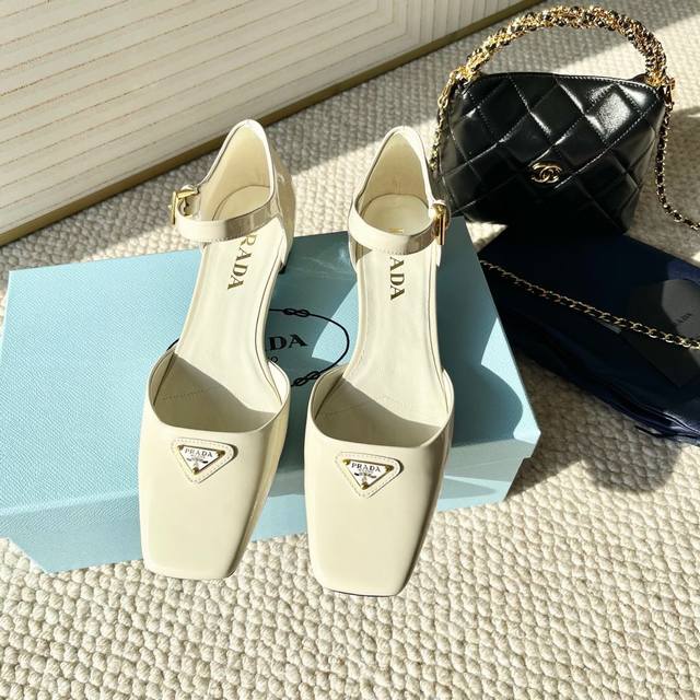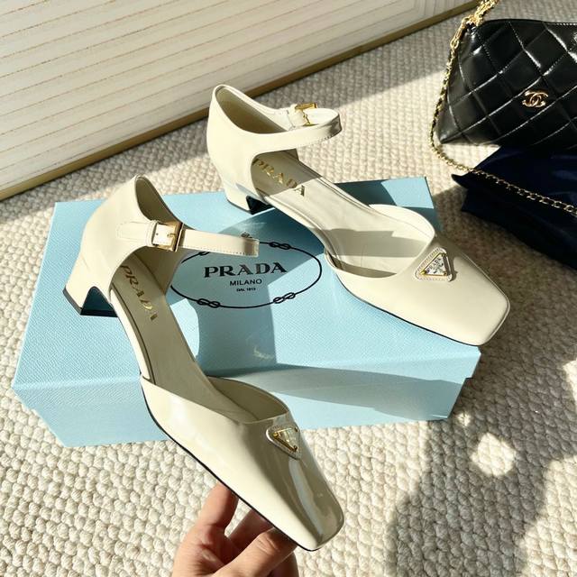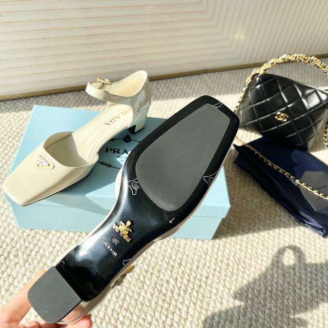代购版Prada普拉达25年新款 方头小矮跟单鞋 中空凉鞋鞋面:牛漆皮 开边珠牛皮黑大底:真皮底正码:35-39订做34.40.41