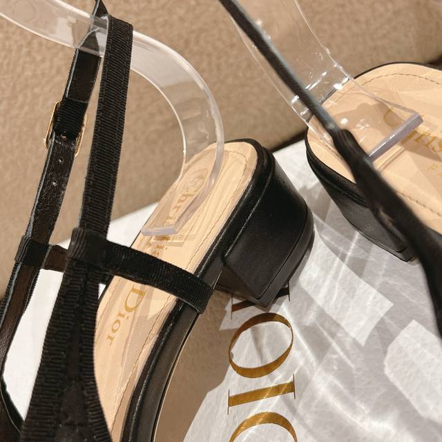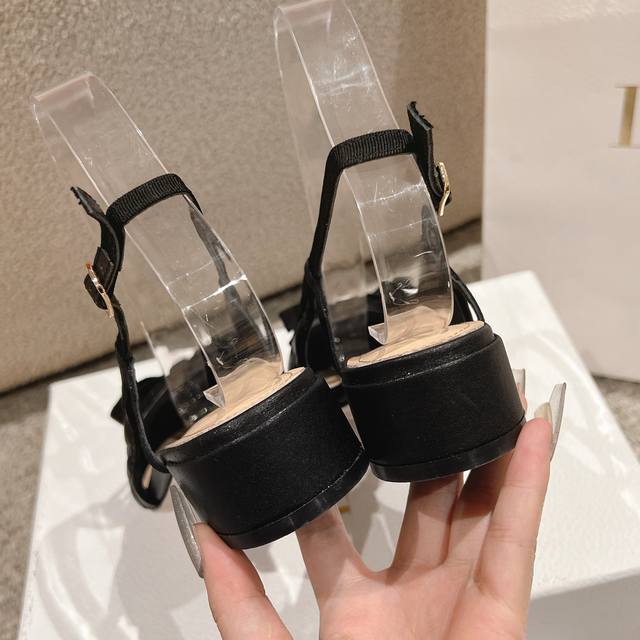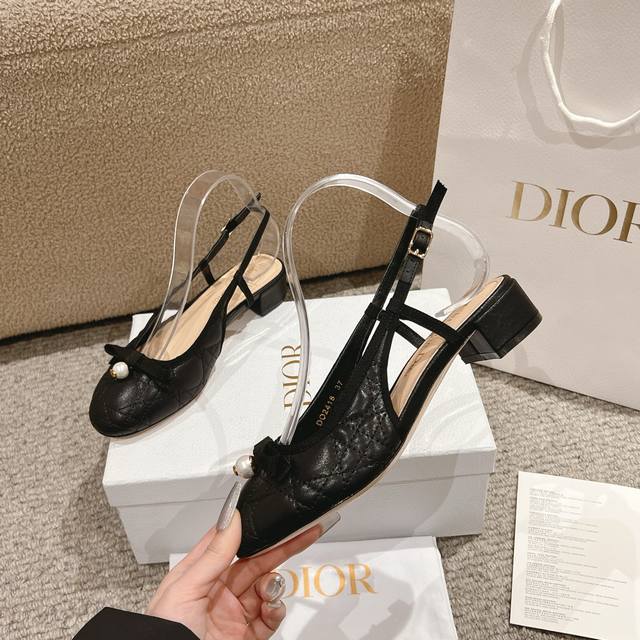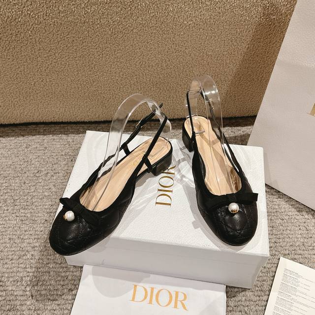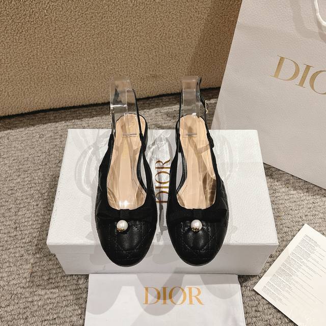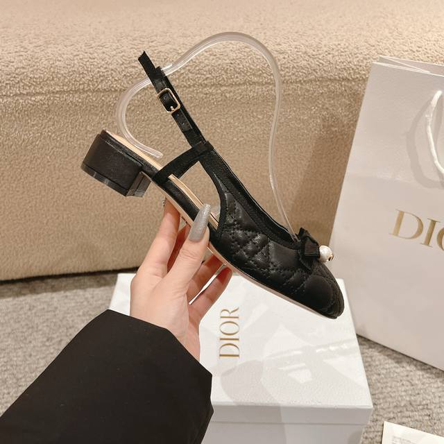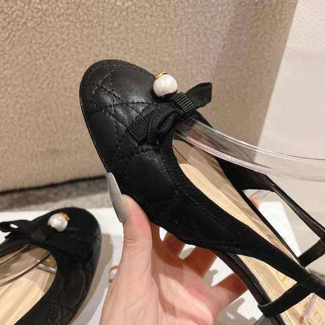 迪奥 Dior 2025春夏高定系列新款 Ballet 标志性电绣藤格纹低跟芭蕾舞女鞋 ,可调节扣带正面饰有罗缎蝴蝶结 装饰性CD树脂珍珠字母logo珍珠扣粗跟蝴蝶结凉鞋