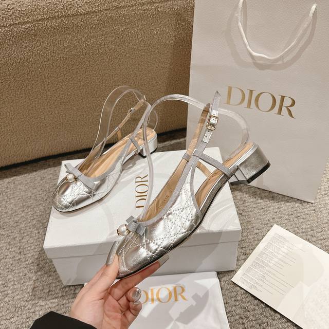 迪奥 Dior 2025春夏高定系列新款 Ballet 标志性电绣藤格纹低跟芭蕾舞女鞋 ,可调节扣带正面饰有罗缎蝴蝶结 装饰性CD树脂珍珠字母logo珍珠扣粗跟蝴蝶结凉鞋