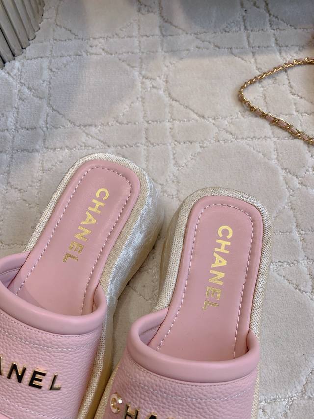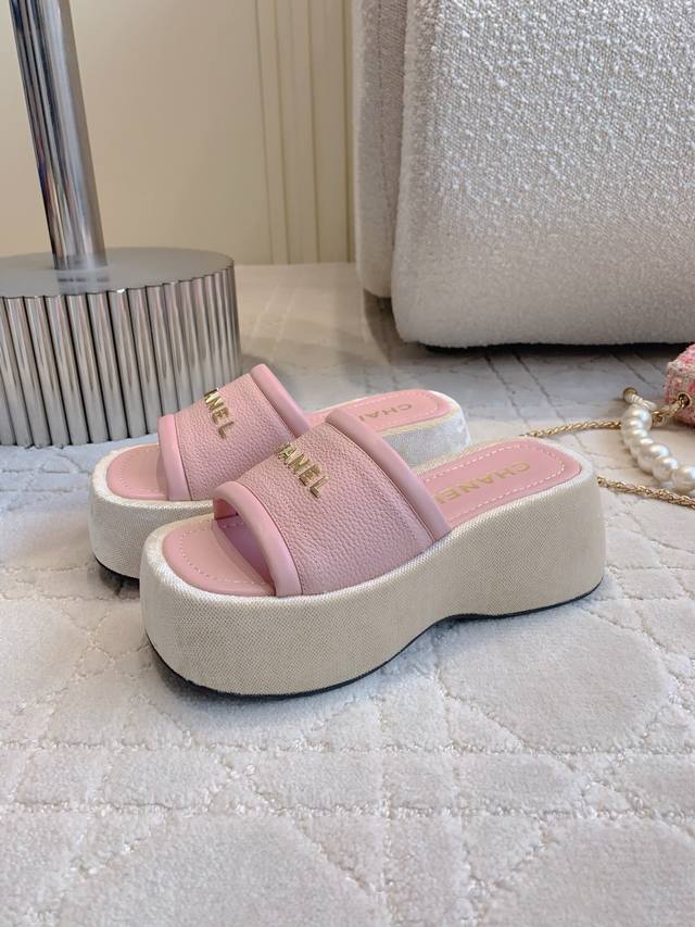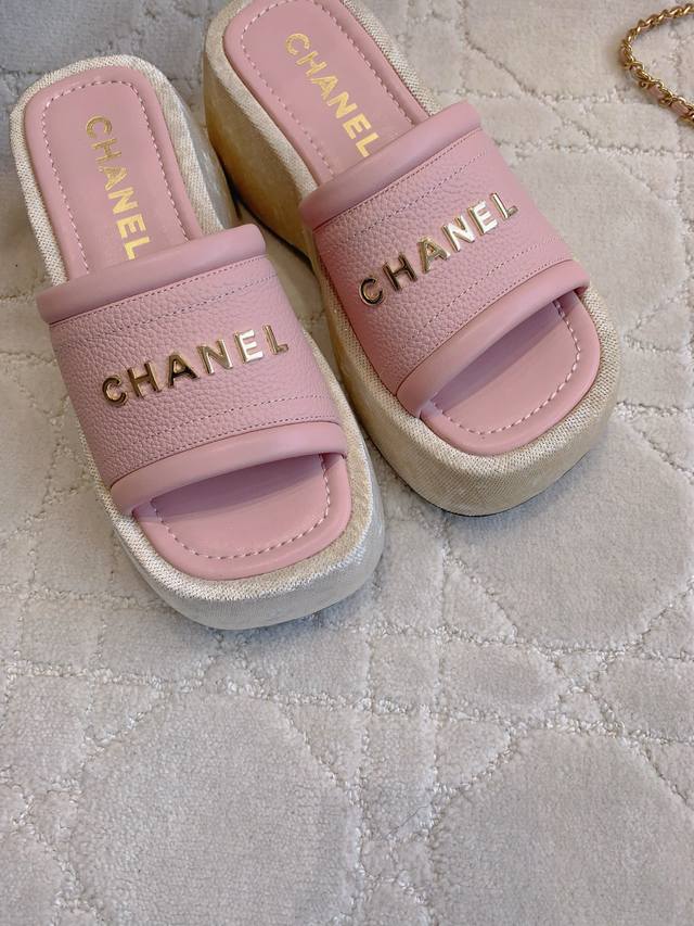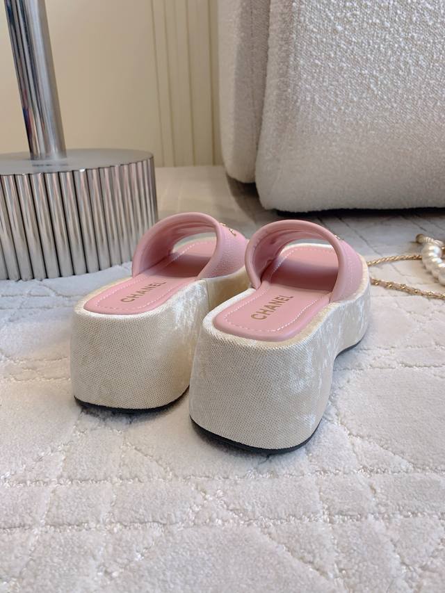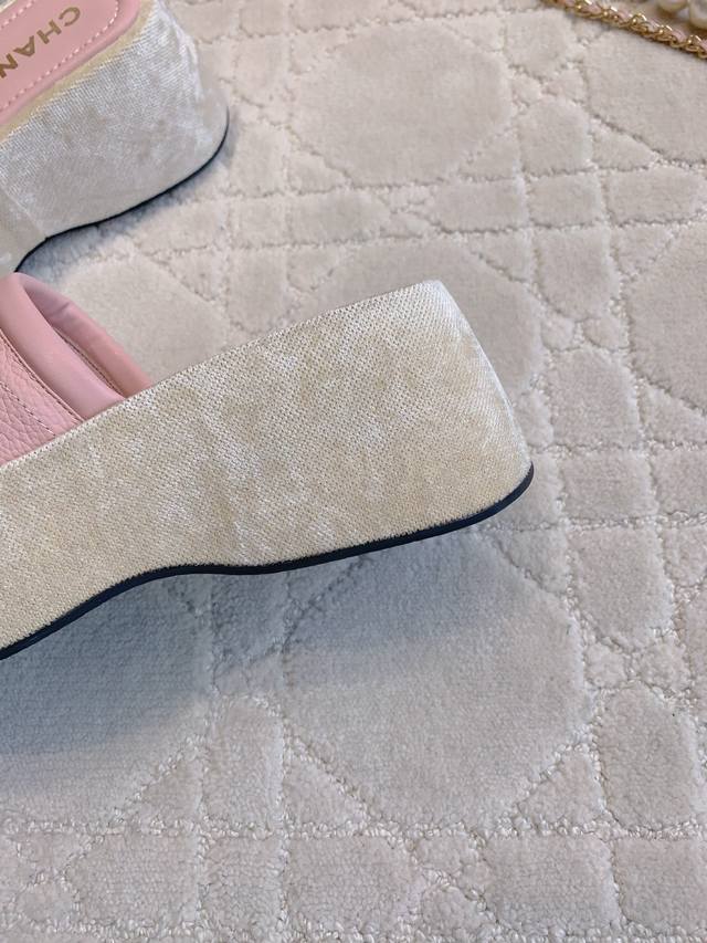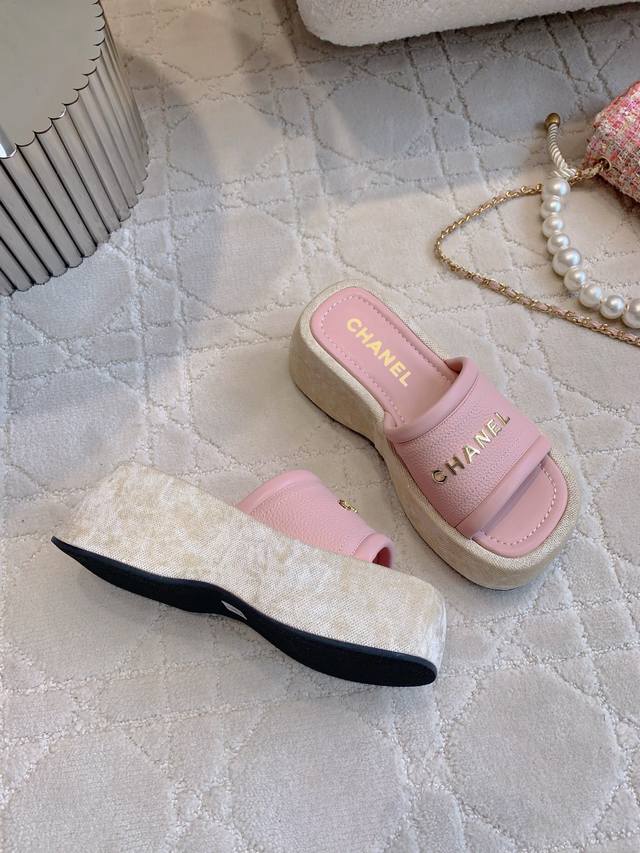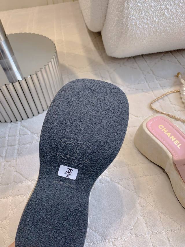出厂价 CHANE*新款厚底松糕底拖鞋 坡跟设计脚感非常舒适 上脚秒变大长腿 鞋面牛皮 内里垫脚羊皮 原版开模防滑底 跟高7.5cm 尺码35-39 40 41