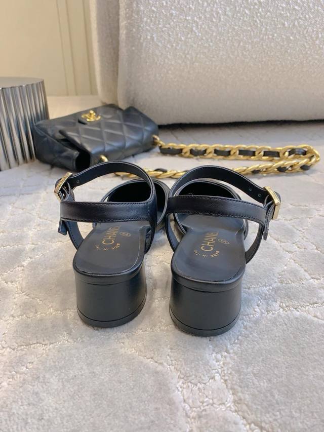 出厂价 CHANE*新款sling back粗跟凉鞋 经典简约百搭 好穿不过时 经典双C刺绣尽显精致 鞋面超软羊皮 内里垫脚羊皮 意大利真皮大底 跟高3.5cm