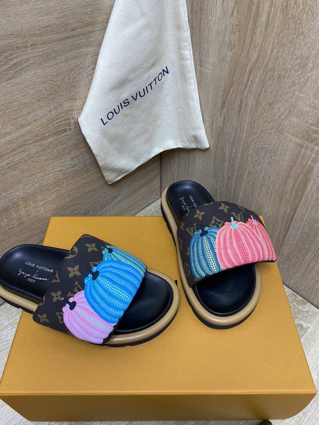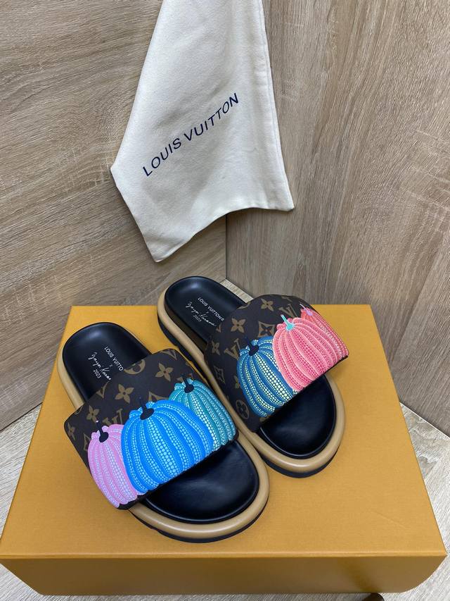 / 出厂价: LV高版本 压花拖鞋超级百搭瘦腿神器厚底设计活力十足,上脚舒适优雅面料:进口莱卡面料/压花内里:水染羊皮 柔软舒适 吸汗 垫脚:高弹pu水台鞋底:发泡