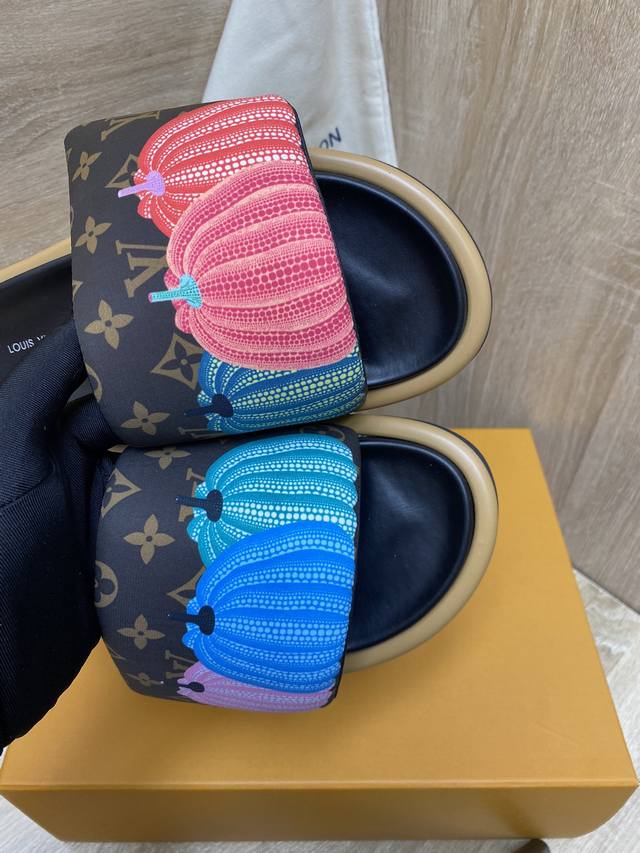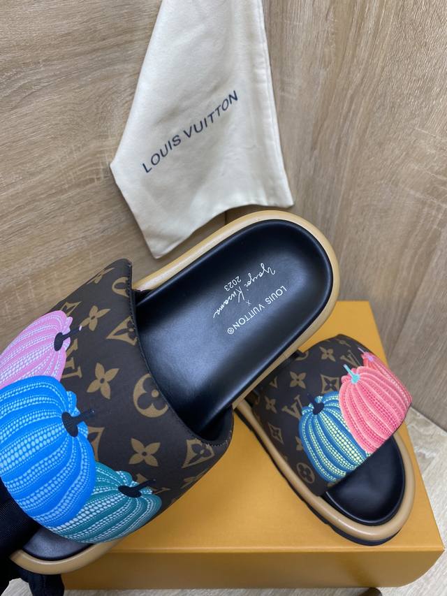 出厂价: LV高版本 压花拖鞋超级百搭瘦腿神器厚底设计活力十足,上脚舒适优雅面料:进口莱卡面料/压花内里:水染羊皮 柔软舒适 吸汗 垫脚:高弹pu水台鞋底:发泡