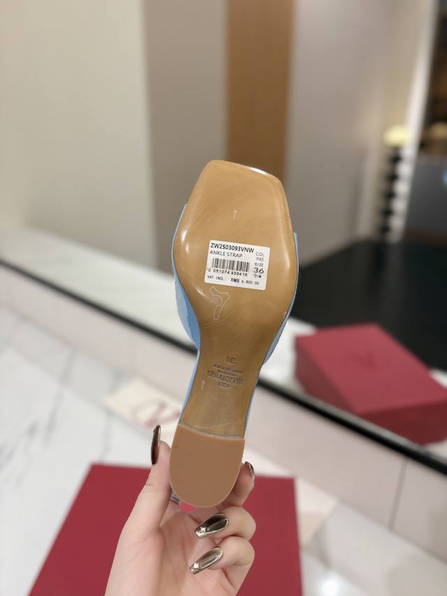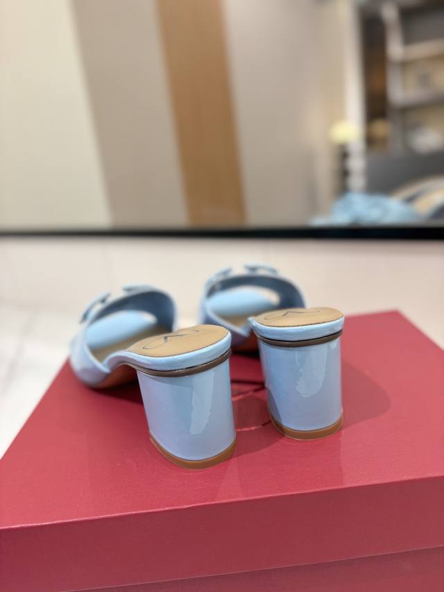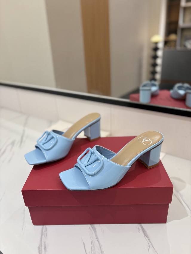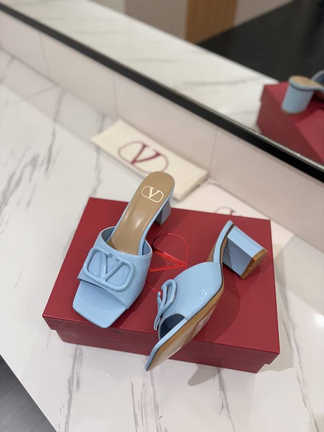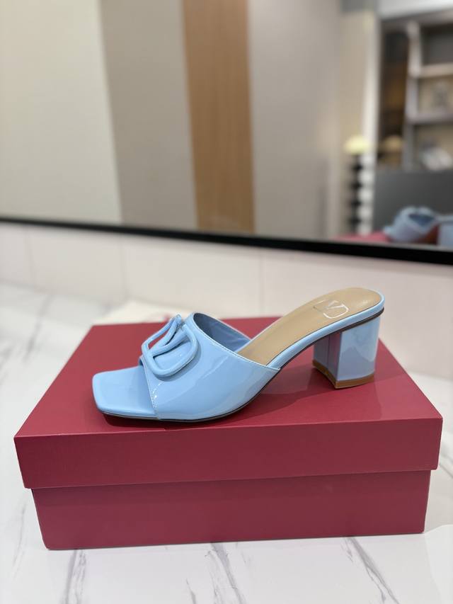 / 出厂价: VALENTINO华伦天奴 最火爆新品粗跟6.0V扣拖鞋最新logo饰扣 简单百搭款简直是夏天时髦巅峰原版复刻鞋面:漆皮,亚皮大底:意大利真皮大底跟高
