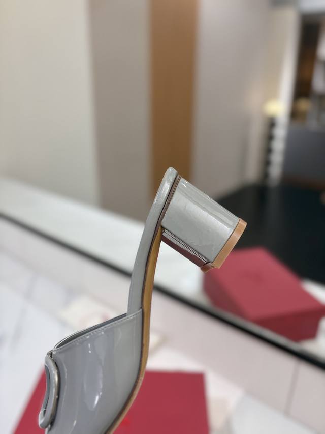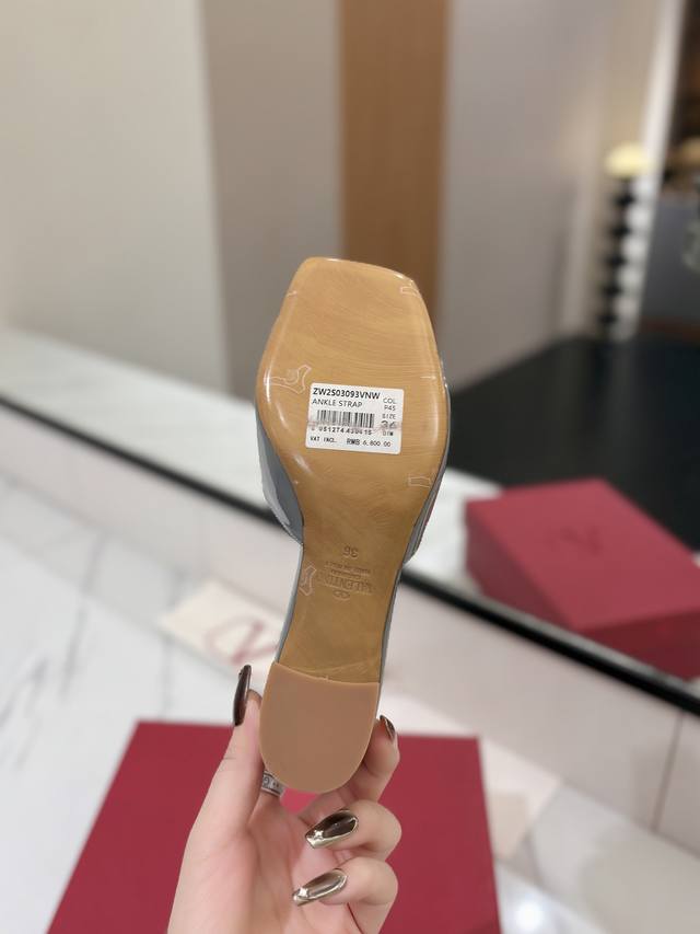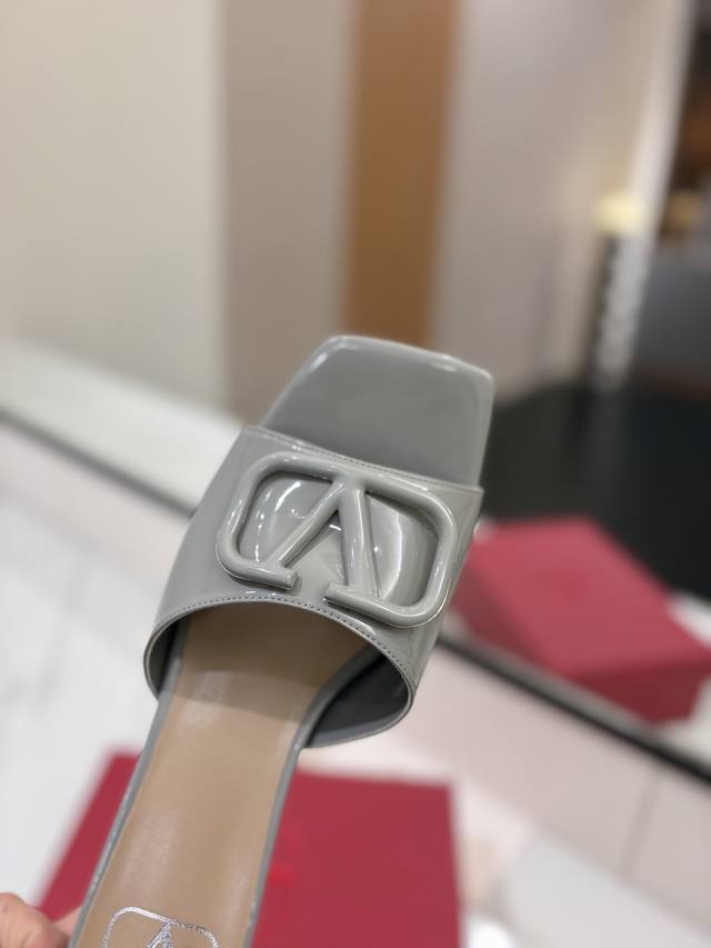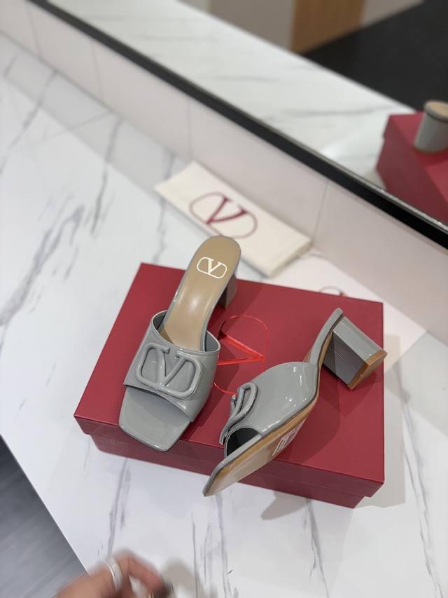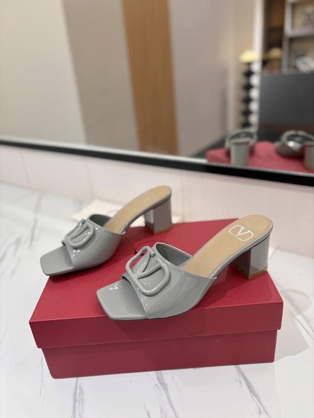 / 出厂价: VALENTINO华伦天奴 最火爆新品粗跟6.0V扣拖鞋最新logo饰扣 简单百搭款简直是夏天时髦巅峰原版复刻鞋面:漆皮,亚皮大底:意大利真皮大底跟高