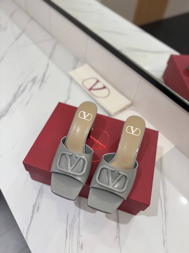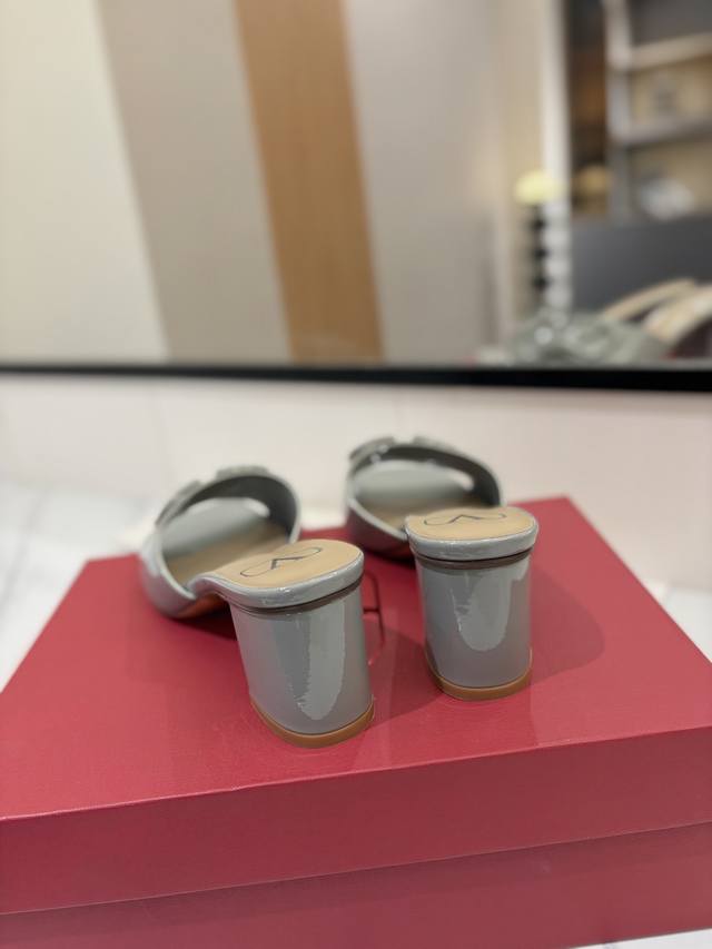 出厂价: VALENTINO华伦天奴 最火爆新品粗跟6.0V扣拖鞋最新logo饰扣 简单百搭款简直是夏天时髦巅峰原版复刻鞋面:漆皮,亚皮大底:意大利真皮大底跟高