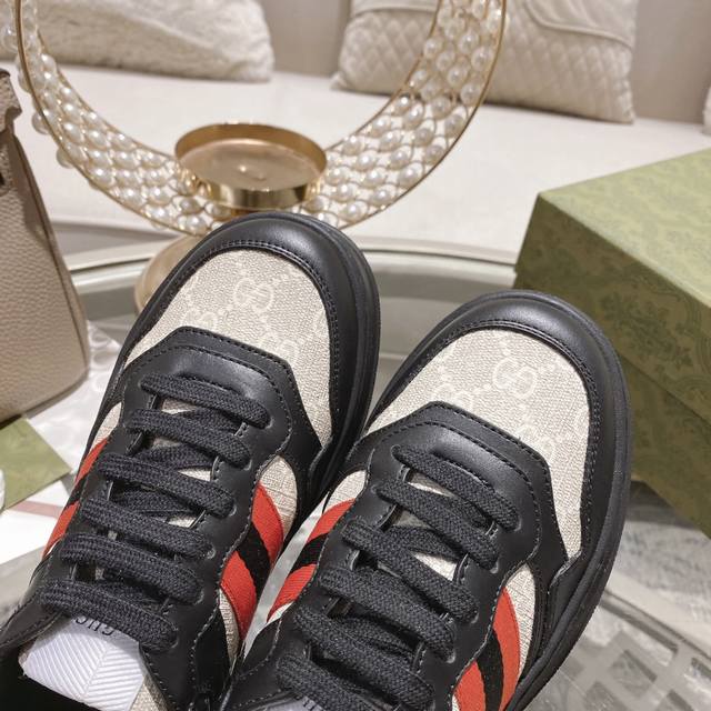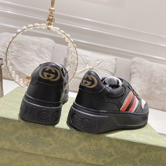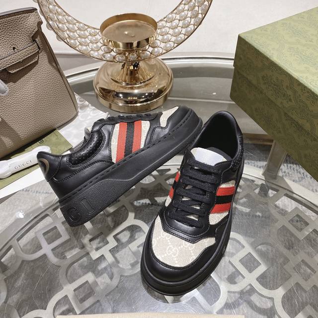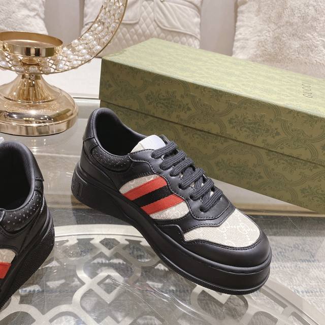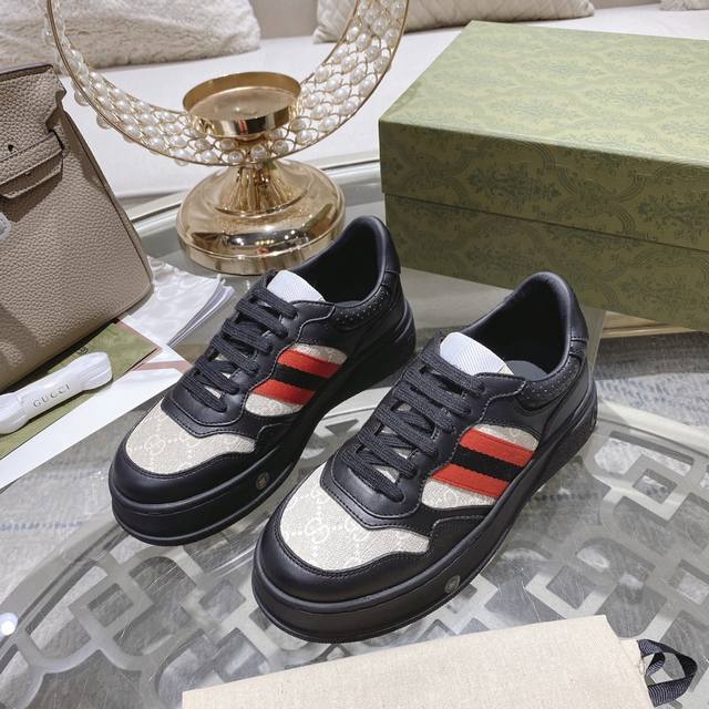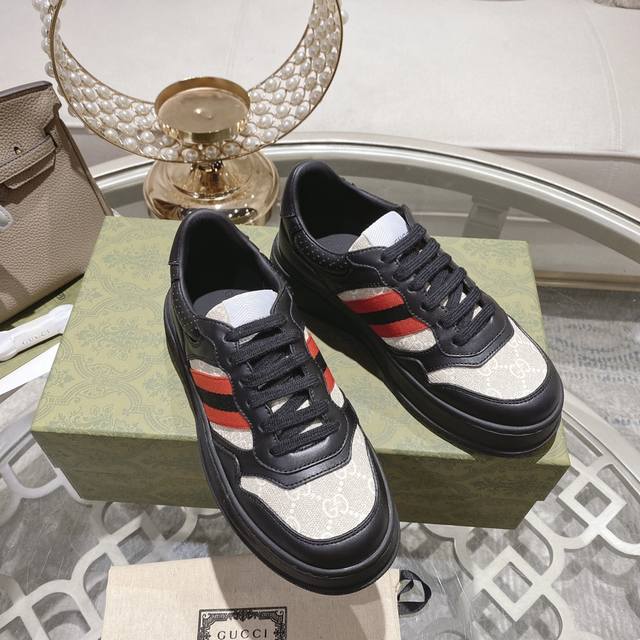 最顶级版本鞋面原版定制小牛皮面料,搭配GUCC经典老花布织带、穿孔、压纹工艺,内里牛皮,垫脚牛皮,脚感舒适柔软!原版复刻1:1开模IP轻料底,4cm增高厚底!