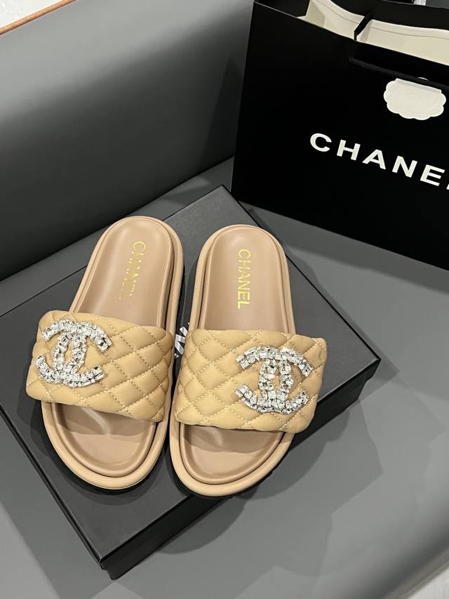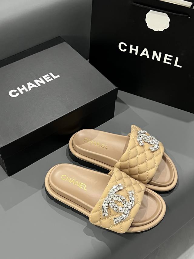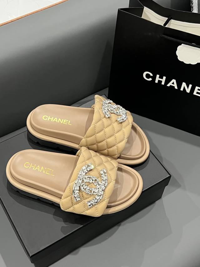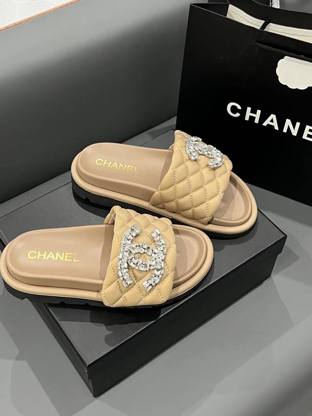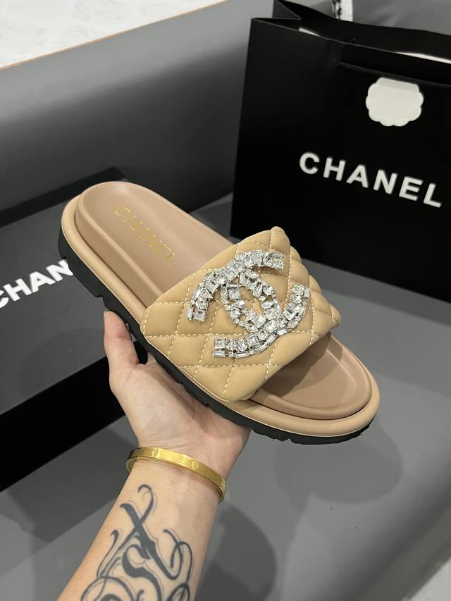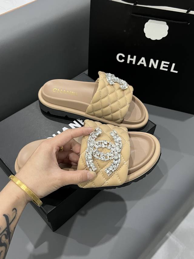 出厂: Chanel的本命年吗这么火的 chanel拖鞋#上街穿的拖鞋 #好穿又好搭 #凉拖香奶奶又一力作#香奈儿魔术贴拖鞋24年最新款菱格大钻扣上脚穿真的舒适