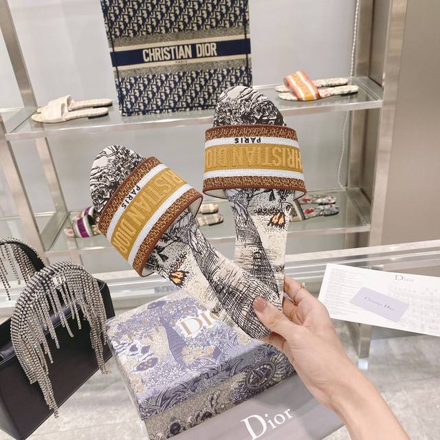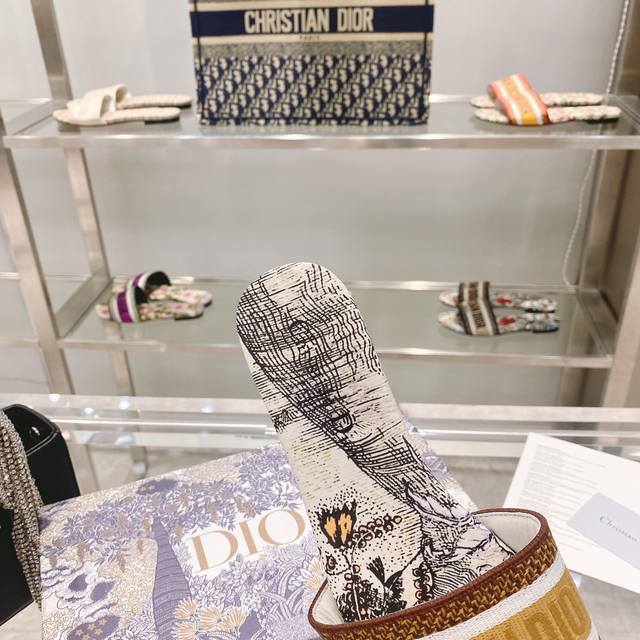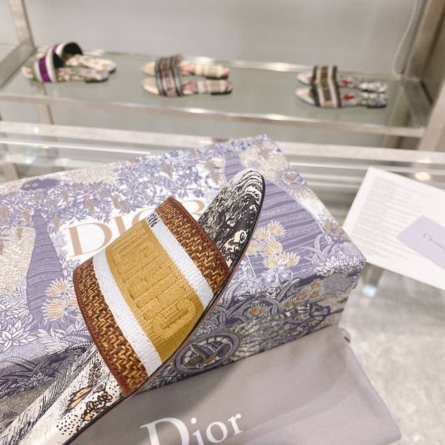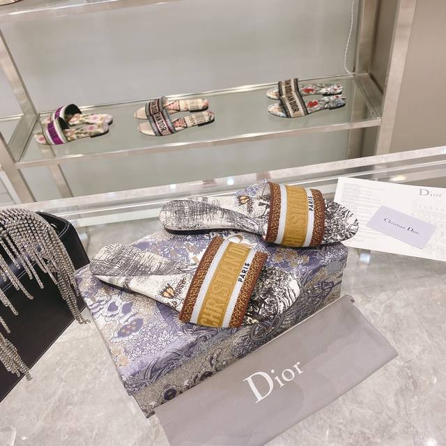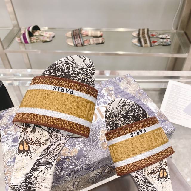 CD迪奥女士老花刺绣皮底拖鞋