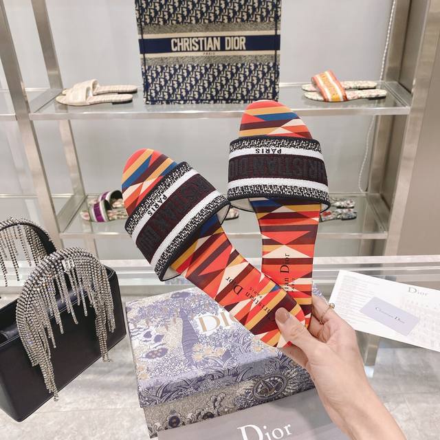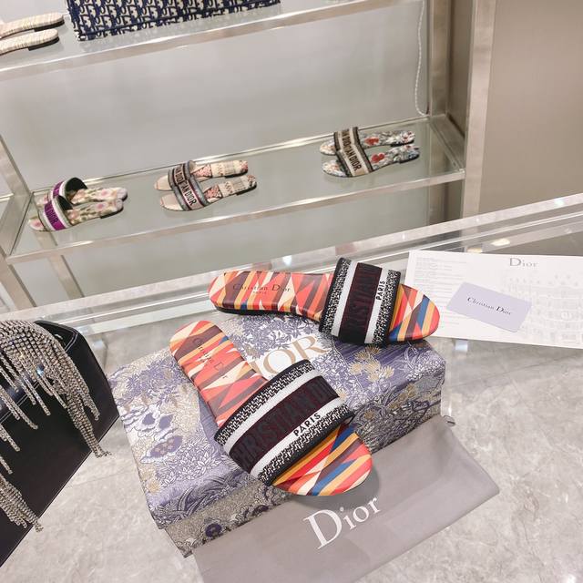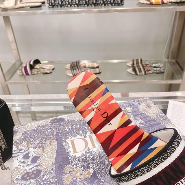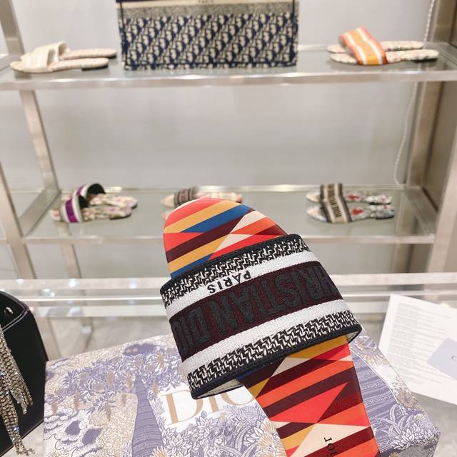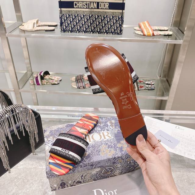 CD迪奥女士老花刺绣皮底拖鞋