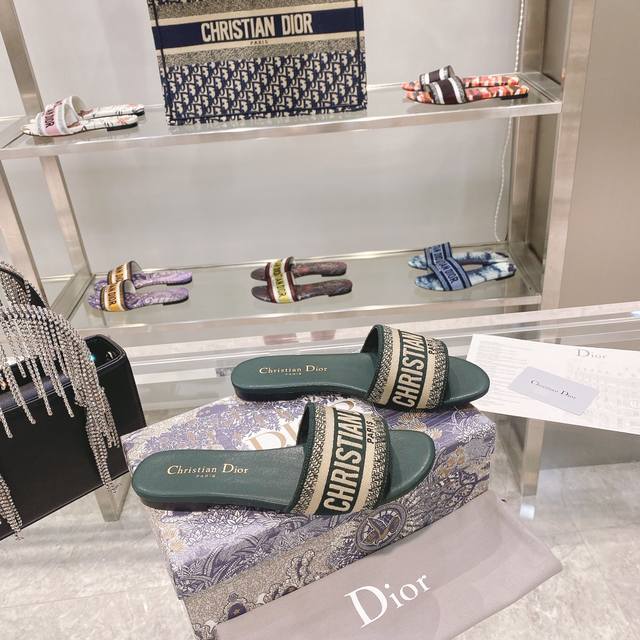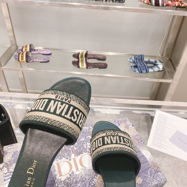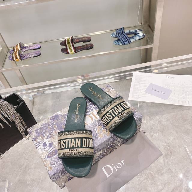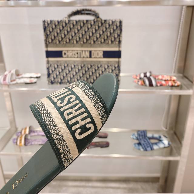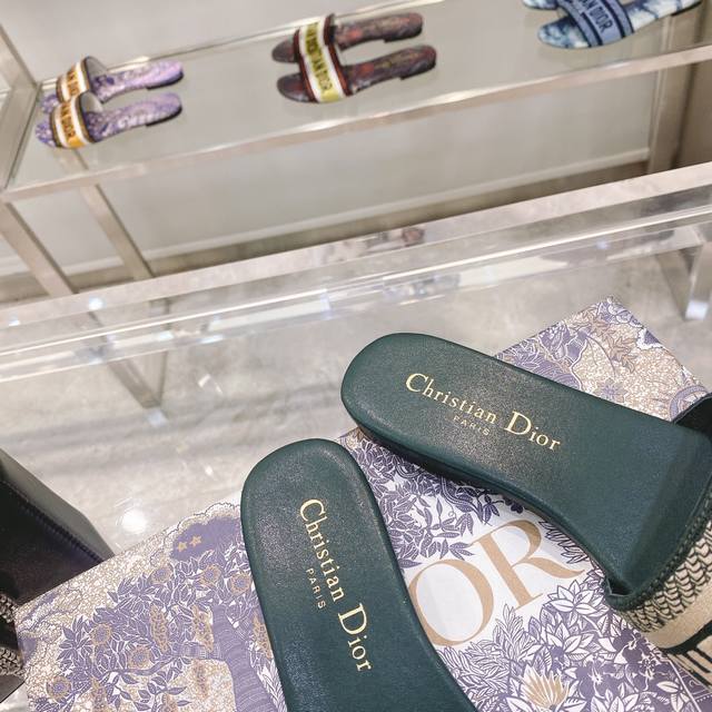 CD迪奥女士老花刺绣皮底拖鞋