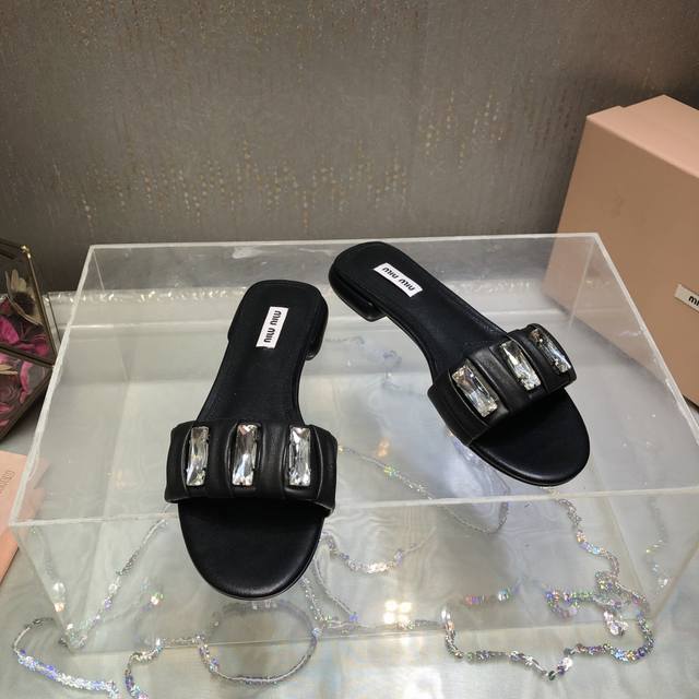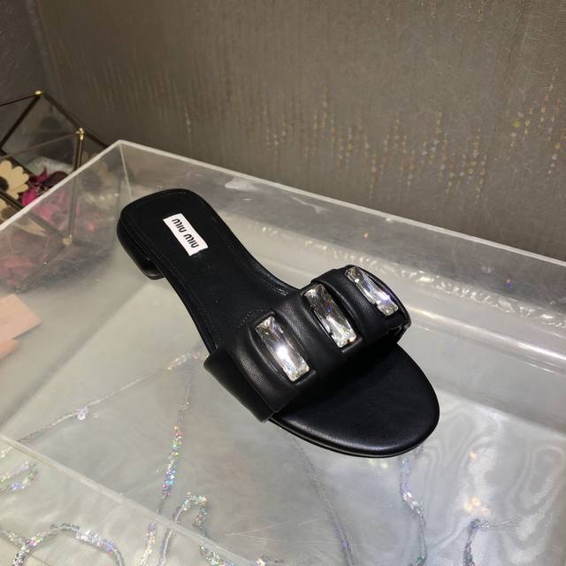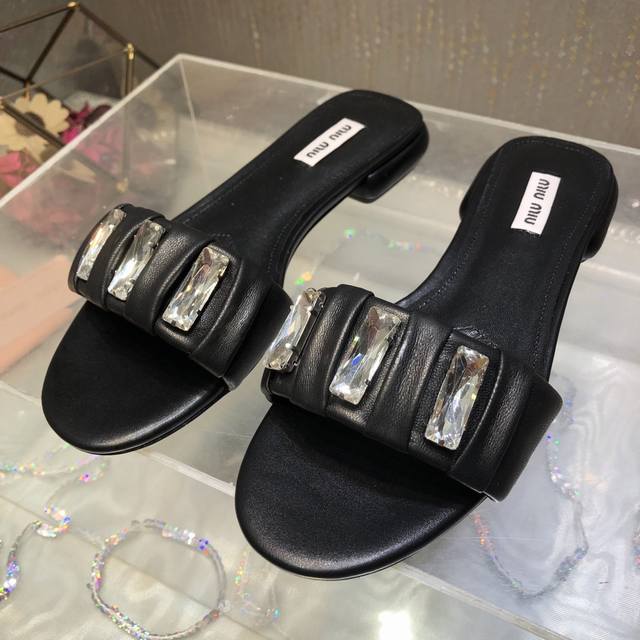 / 出 ~miu mi*25夏季新品 钻扣一字拖鞋 上脚性感时尚!真的好看!可盐可甜的一款仙女凉拖 !鞋面:混种羊皮内里 垫脚:羊皮大底:意大利进口真皮底跟高:2c