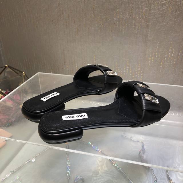 出 ~miu mi*25夏季新品 钻扣一字拖鞋 上脚性感时尚!真的好看!可盐可甜的一款仙女凉拖 !鞋面:混种羊皮内里 垫脚:羊皮大底:意大利进口真皮底跟高:2c