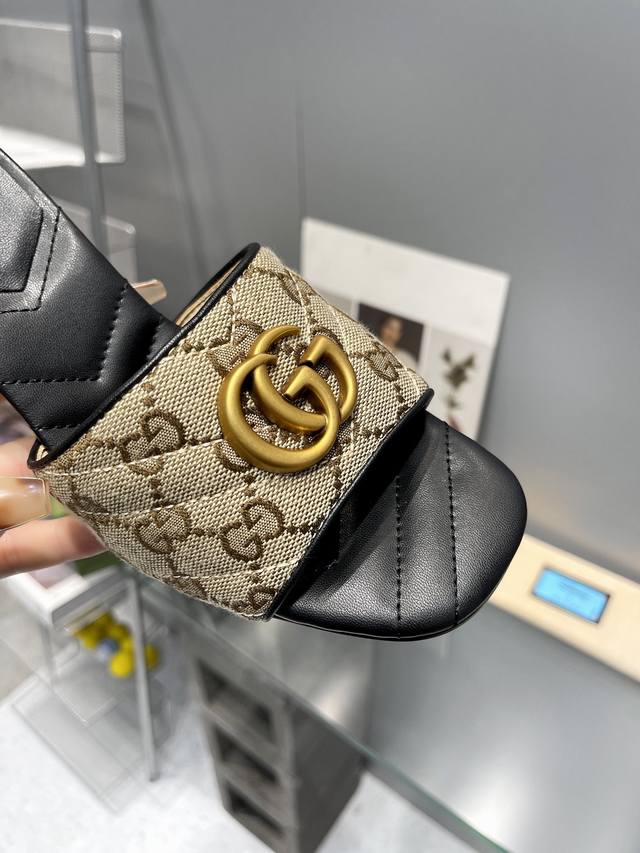 工厂价 Gucc*家经典双 G 扣细跟拖 高版本 长期做货 推荐给美眉们 一定要试试这款拖鞋 又一款心头爱 ~版型超正 做工细节完美 ,上脚非常舒适 高雅百搭。