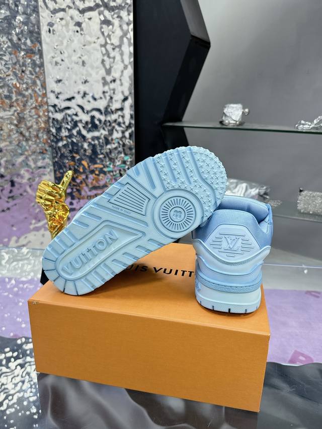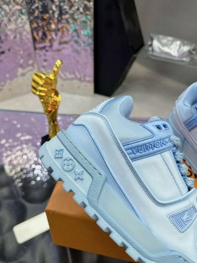原版购入开发 做货 本款 LV Trainer Maxi 运动鞋取材柔软牛皮革,以大号廓型和凸纹外底重绎原版 LV Trainer 运动鞋设计,演绎复古篮球鞋的灵感启发。橡胶 LV 字母标注鞋面,Monogram 花卉栖身外底。