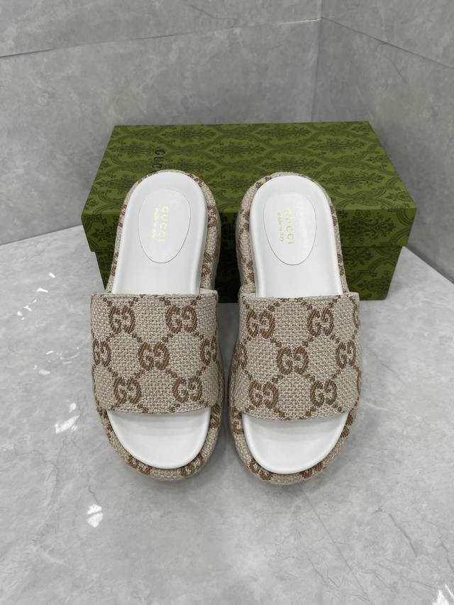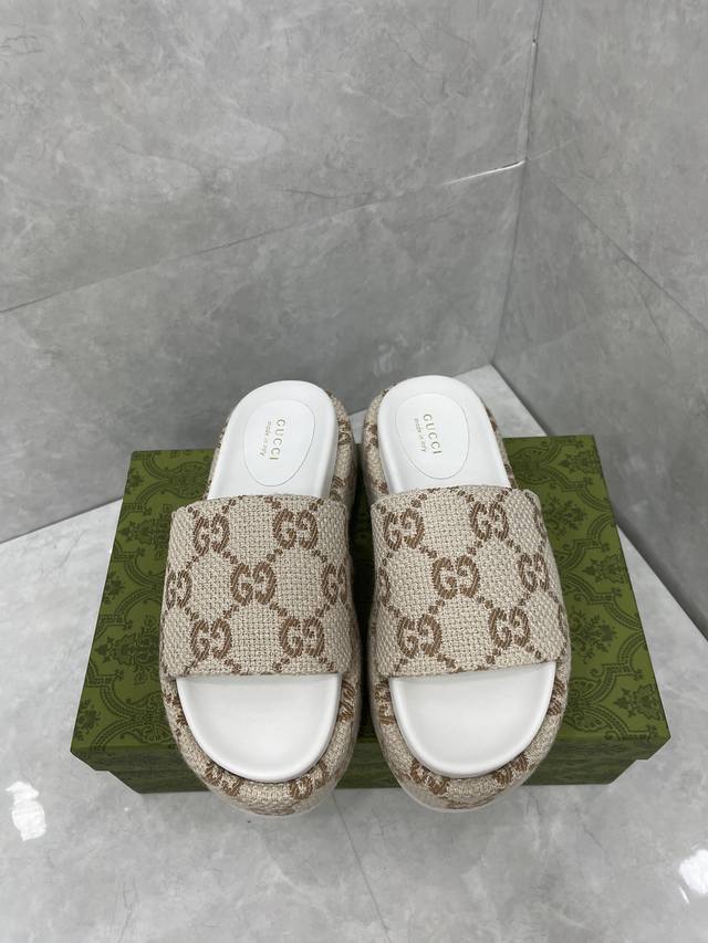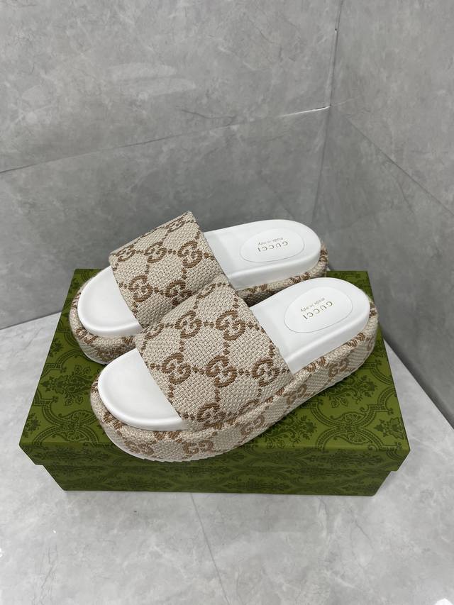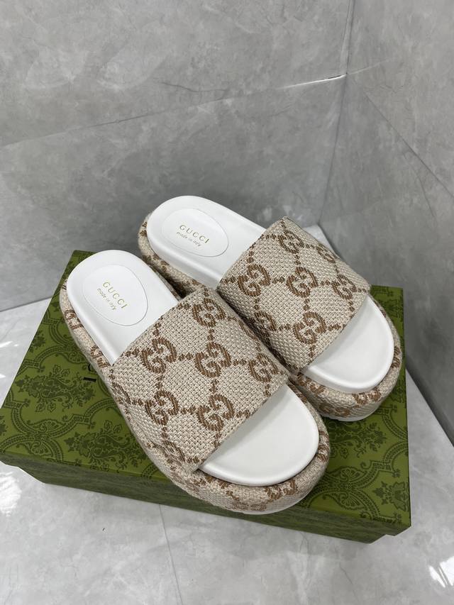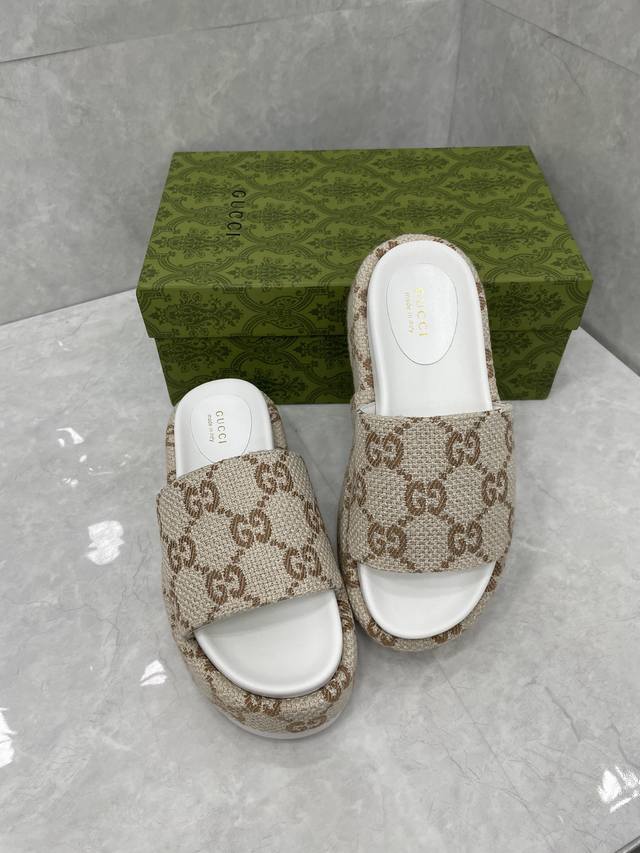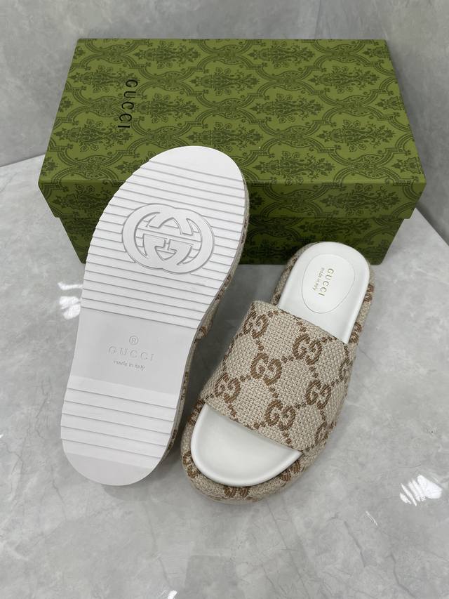 新款多色亚麻女士防水台拖鞋,GG标识于20世纪70年代开始使用,由始于30年代的早期Gucci钻石菱格纹演化而来,是Gucci颇具代表性的传统精髓。经以明艳色调亮眼演绎,GG标识为这款运动鞋增添瞩目焦点。鞋底运用浮雕式设计突显Guccio Gucci先生的姓名首字母图案,强调品牌深厚传承。