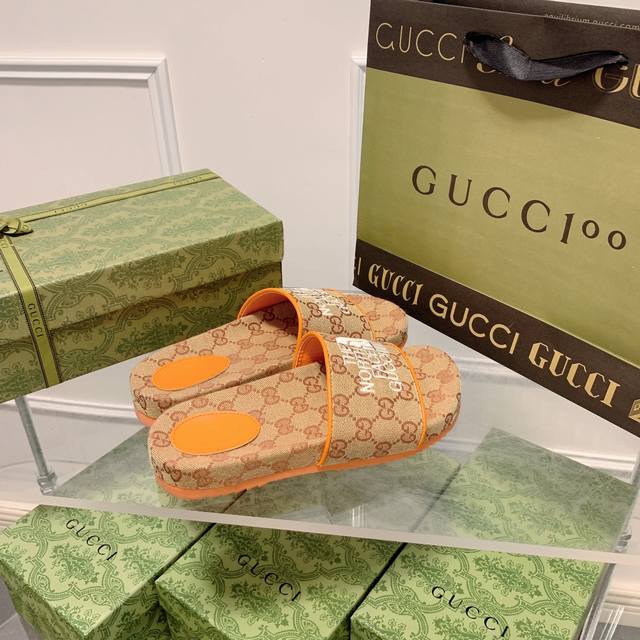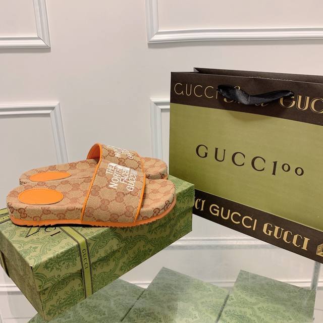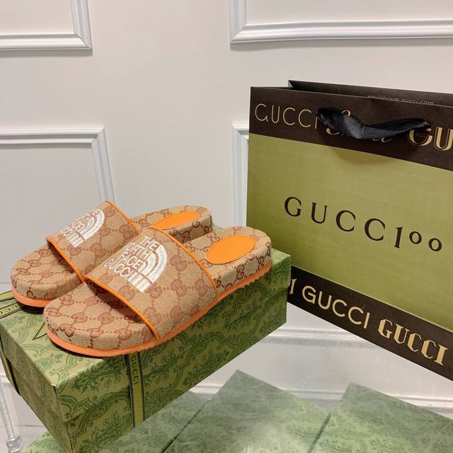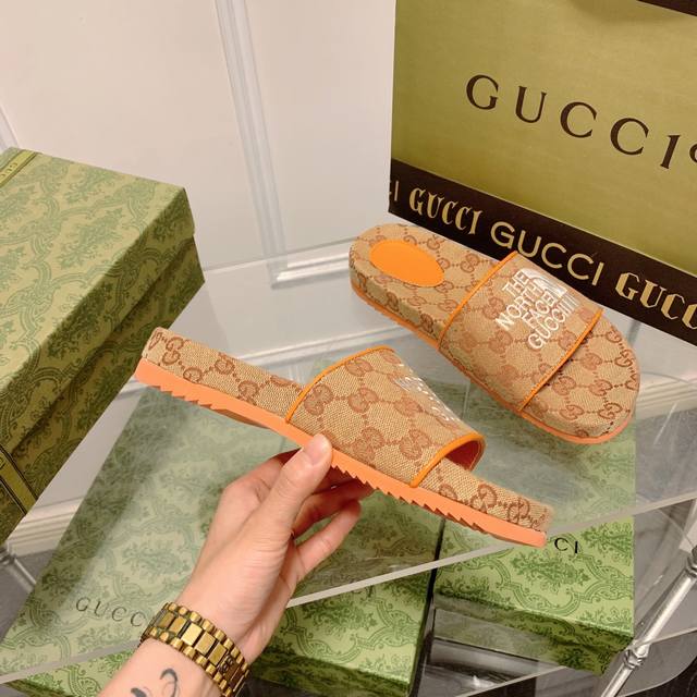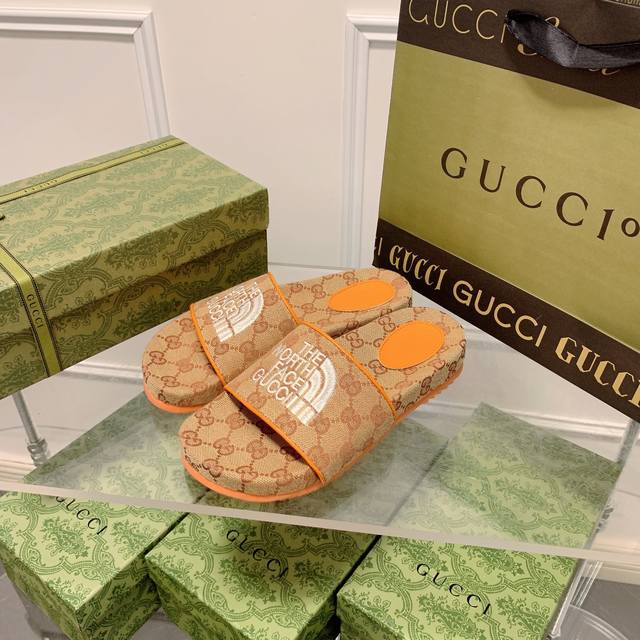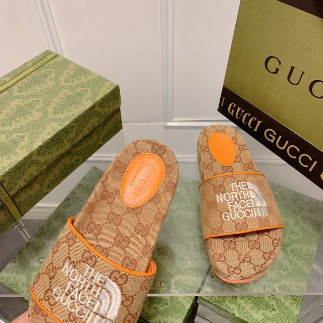 GUCCI 古驰春夏新款 北面联名款凉拖 电绣平底拖鞋 情侣款