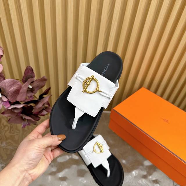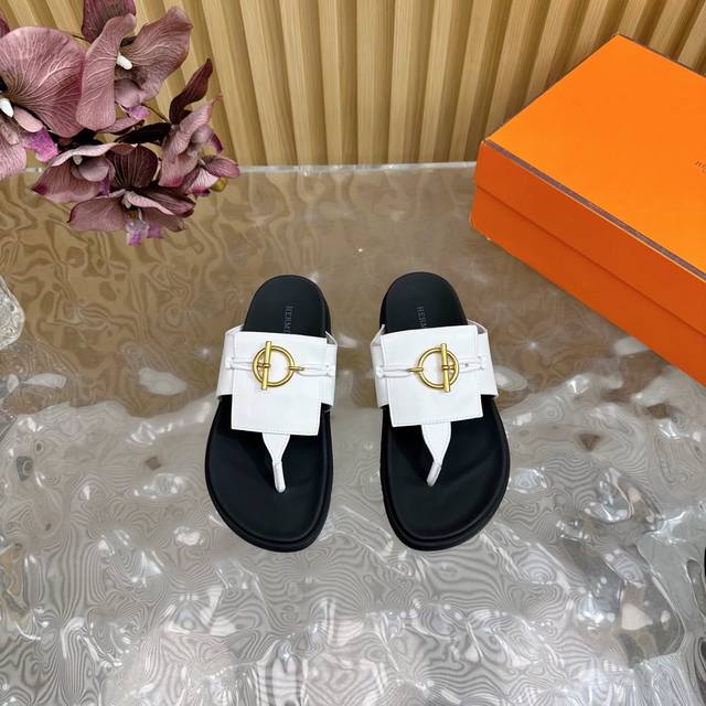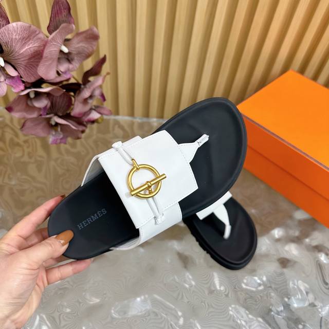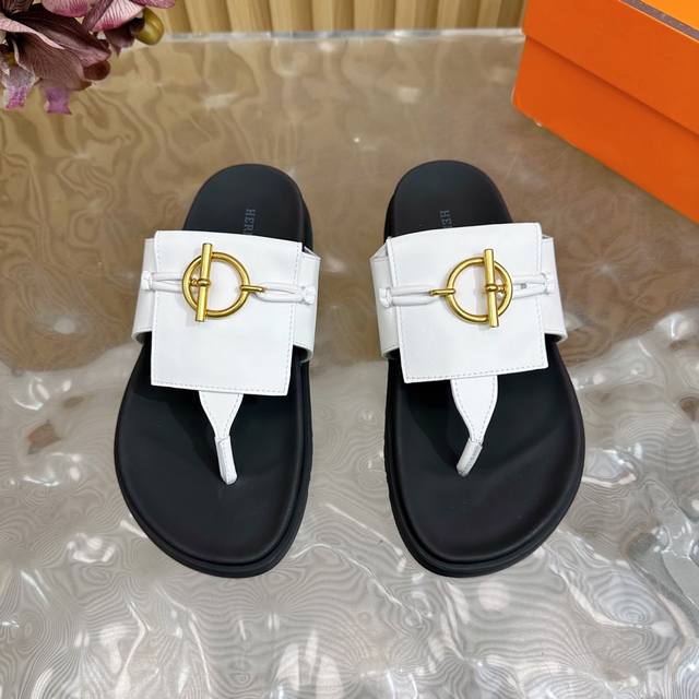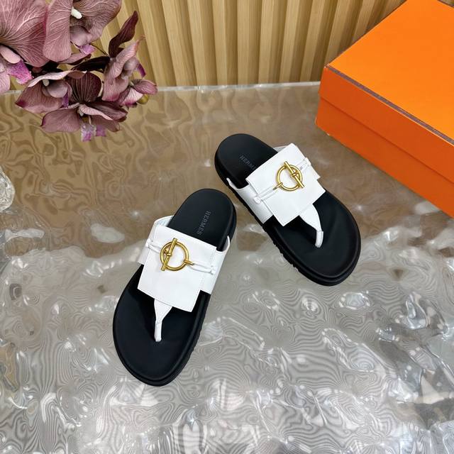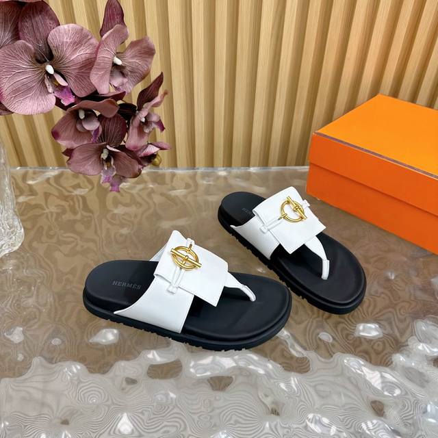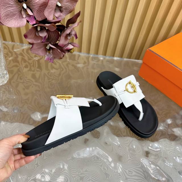 代购级别HERMES爱马仕 2025 最新款大H扣人字扣二舅拖鞋真皮注塑鞋底