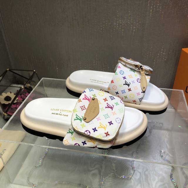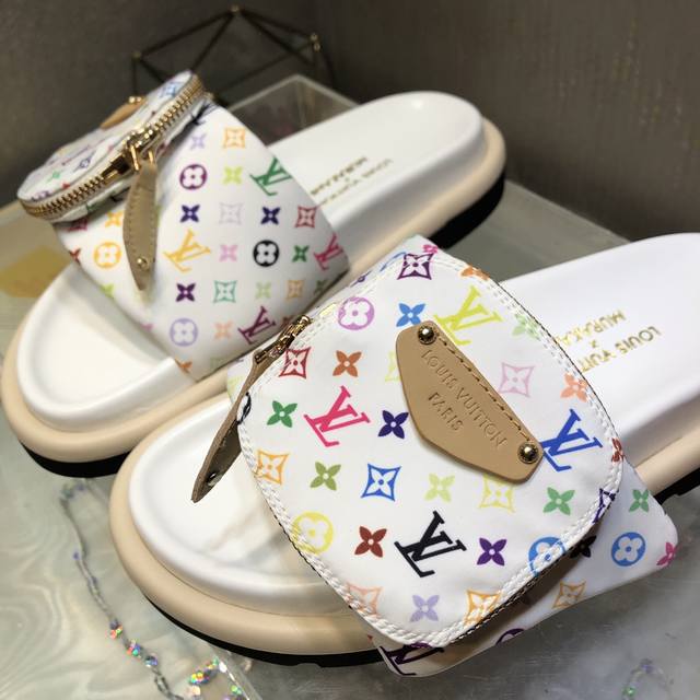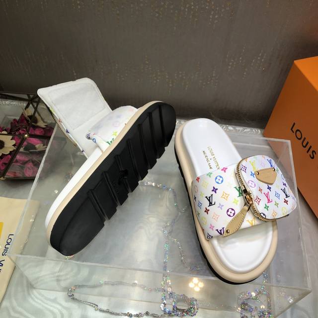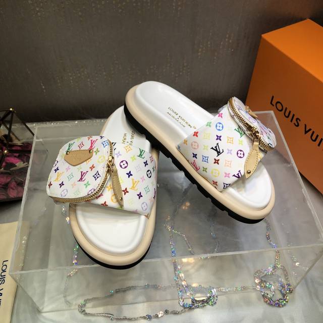 出 顶级版本L.v 25春夏新品爆款老花包包魔术扣拖鞋. 鞋面复刻原版做法内加多层轻羽绒饱满立体 简约大气 !厚底上脚增高 立显大长腿效果! 脚床中底全皮包料!