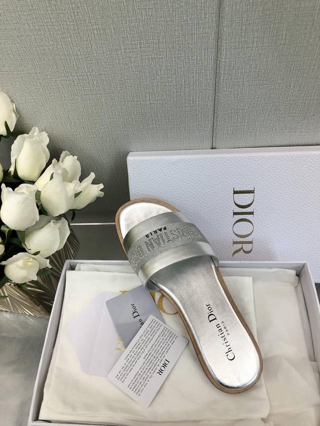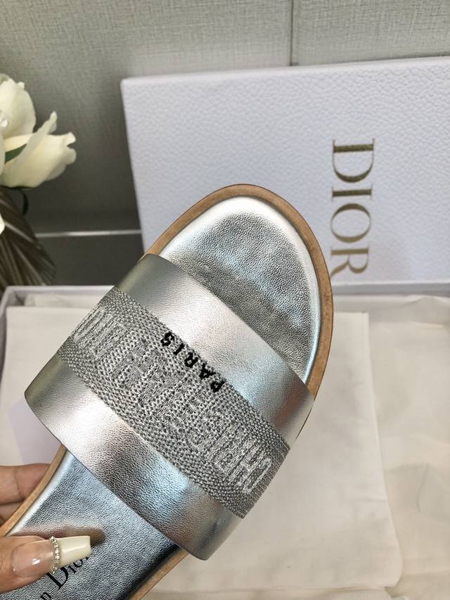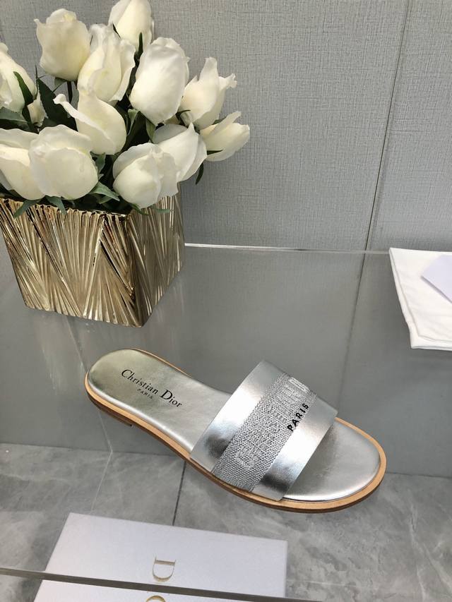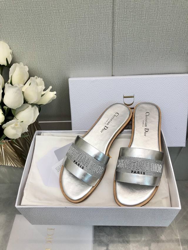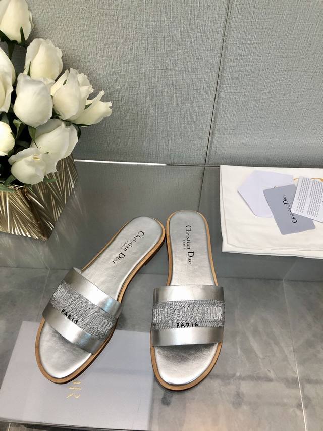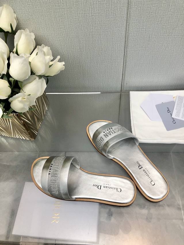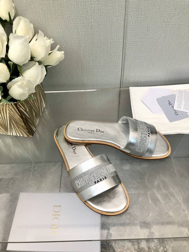 迪奥 Dior 2025 春夏新款女鞋 CD字母刺绣logo平底拼色一字拖鞋 市面顶级版本 材质:鞋面进口牛皮 牛皮皮内里+意大利真皮大底 跟高:平跟size:35-41