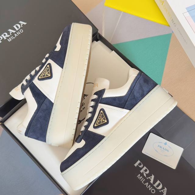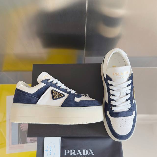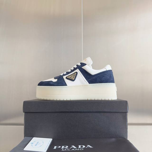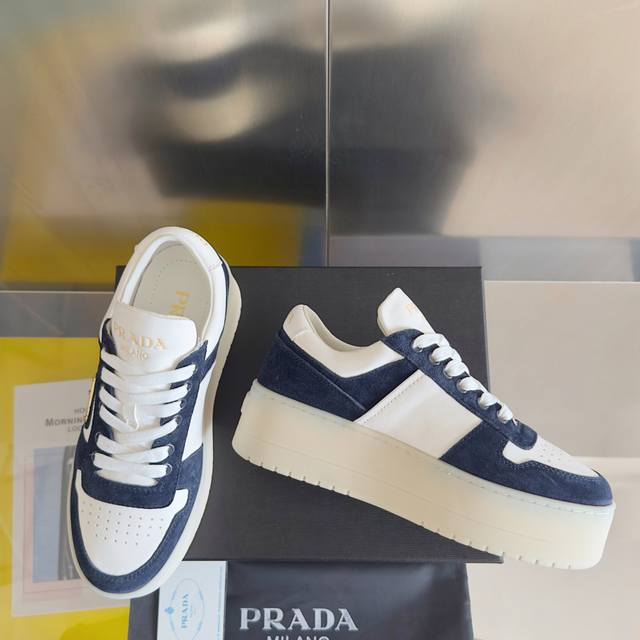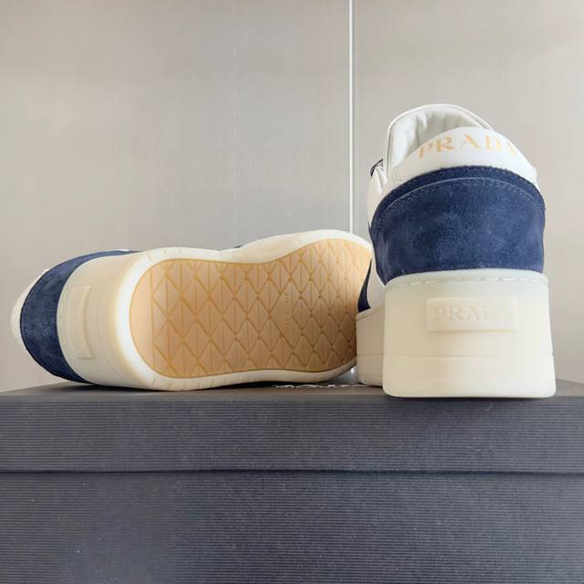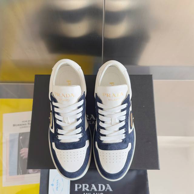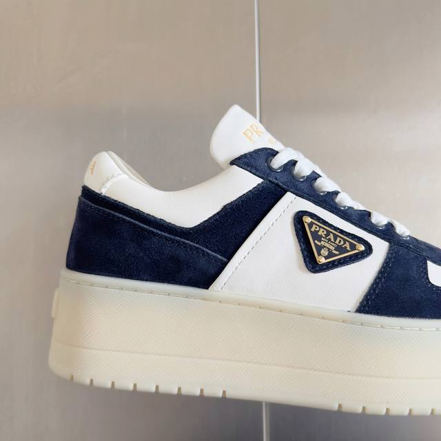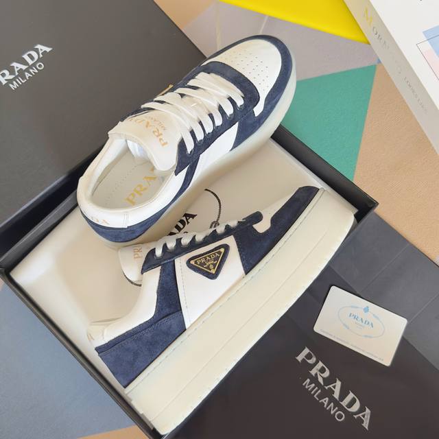 原版购入开发 做货 Downtown Bold运动鞋从1980年代的篮球鞋汲取灵感,运动风设计搭配精致细节。采用穿孔皮革打造,个性的厚底呈现别具一格的现代风格。通过不同角度演绎Prada徽标,饰有标志性的涂珐琅三角形金属徽标,彰显别具一格的经典格调