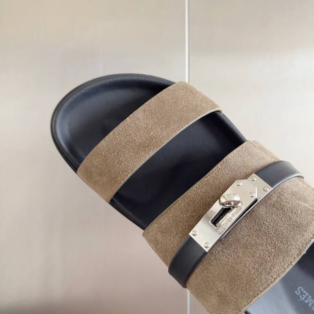 原版购入开发 做货 麂皮山羊皮机能风凉鞋,搭配人体工学橡胶鞋底和经典镀钯Kelly鞋扣 打造日常优雅风范