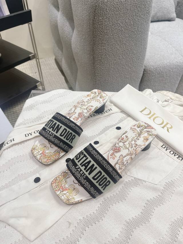 CD迪奥女士老花刺绣皮底拖鞋
