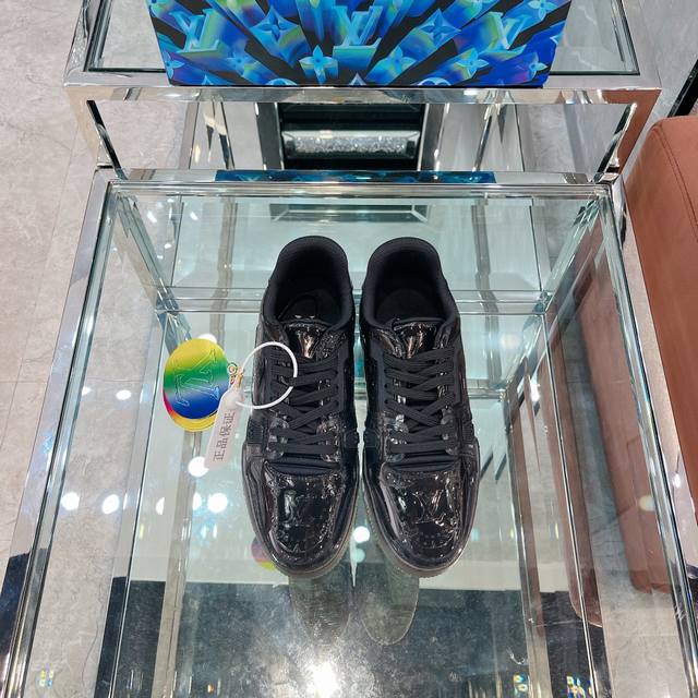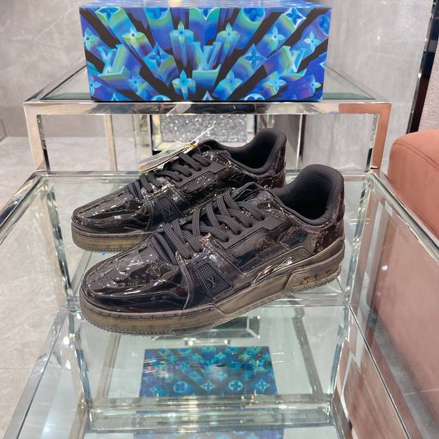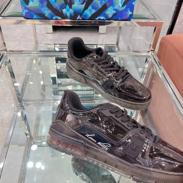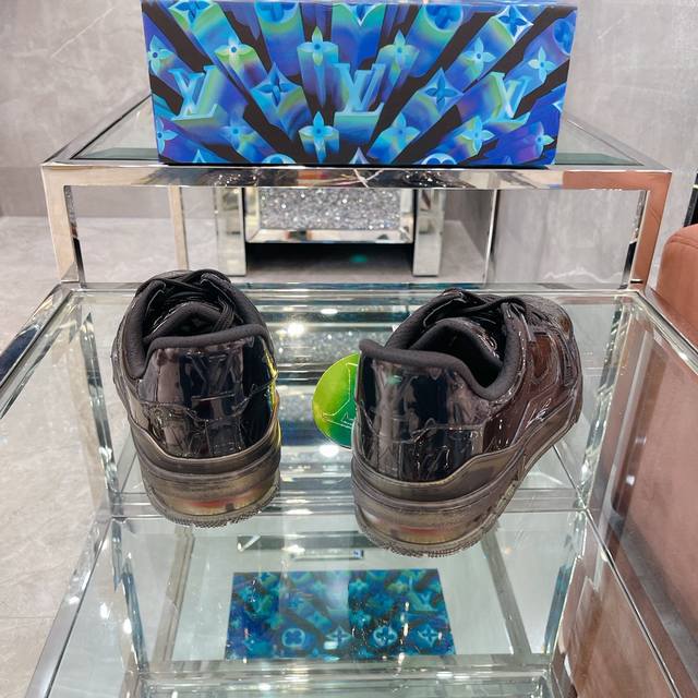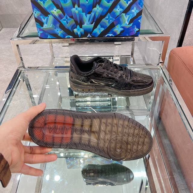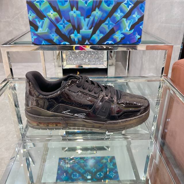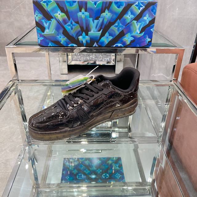 路易威登 秋冬男装秀场再度释放 LV Trainer 运动鞋的个性锋芒。透明阐述当季理念,鞋带和侧面的超大 Monogram 花卉点亮细节,Louis 和 Vuitton 标识分饰左右鞋后。