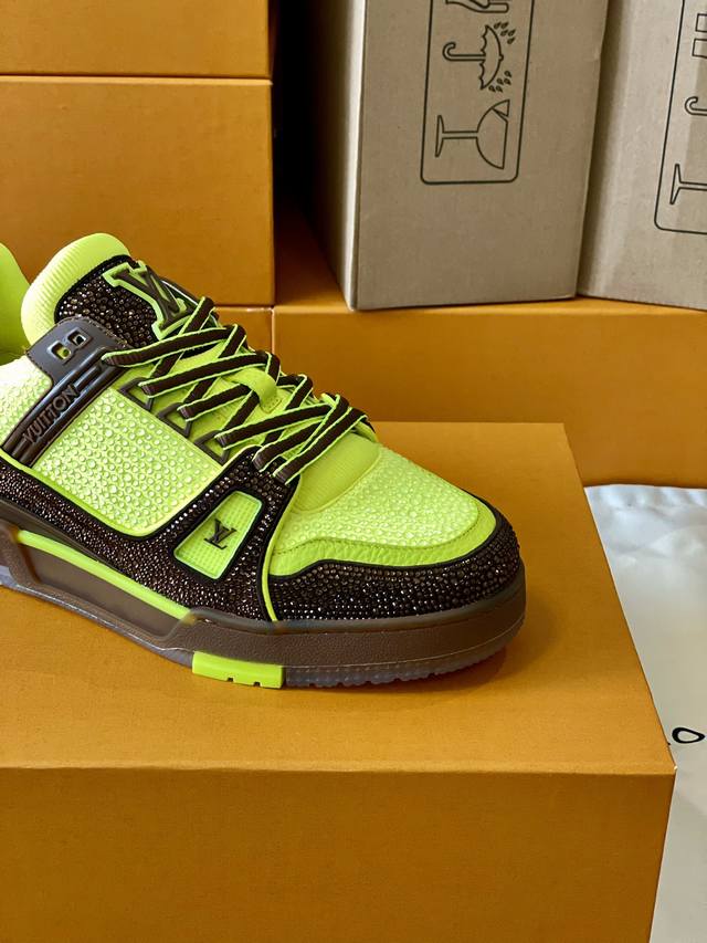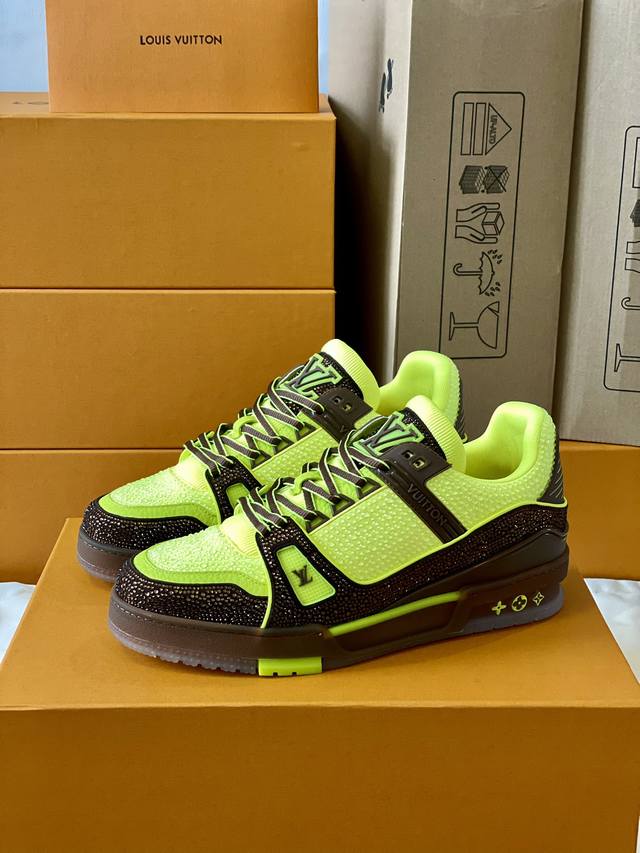本款 LV Trainer 运动鞋闪烁水晶的炫目光芒,向设计师Virgil Abloh 春夏系列推出的原版设计致敬。繁复鞋面和橡胶外底宣示经典笔触,Monogram 花卉点缀其上,传递复古篮球鞋的灵感启发。