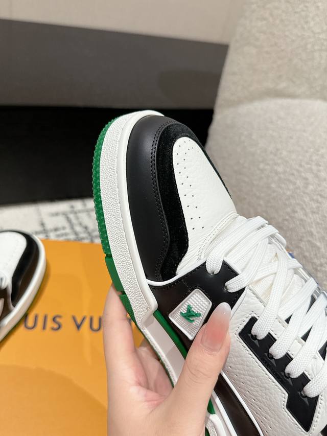 LV Trainer 运动鞋的灵感源自复古篮球鞋,代表 Virgil Abloh 的标志性设计理念 展现复古篮球运动鞋的当代演绎。粒面牛皮革 后者与当季成衣系列设计遥相呼应。Monogram 花卉点缀橡胶外底,LV 字母标注鞋舌。