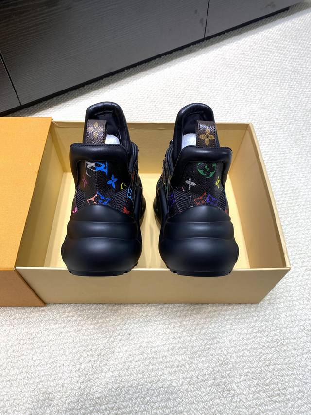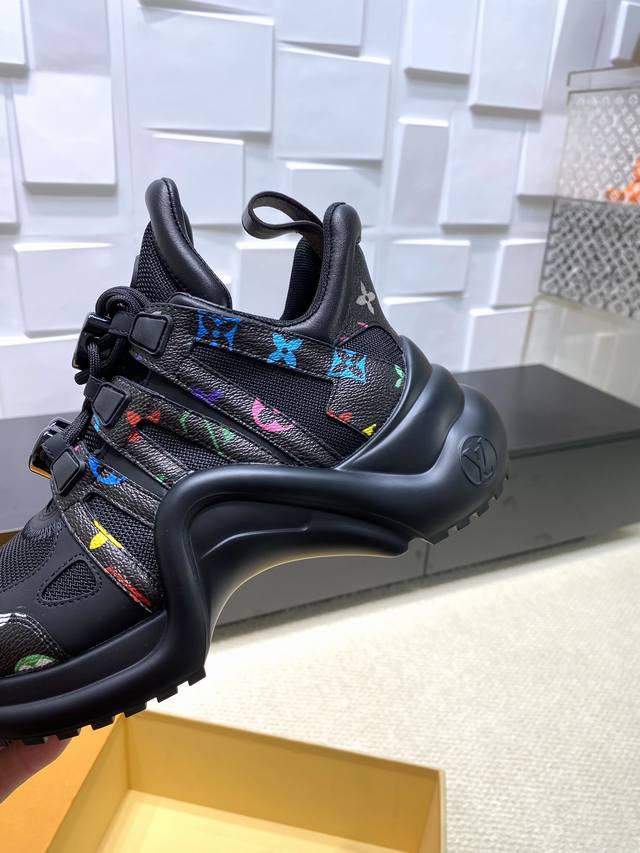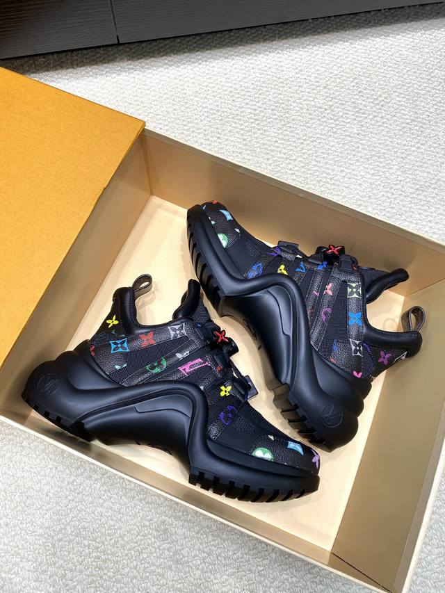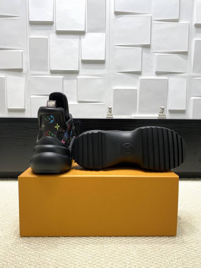 原版购入开发 做货 原版购入开发 做货 本款 LV Archlight 运动鞋出自 Nicolas Ghesquière 之手,以牛皮革裁成妙趣构型。双鞋带点缀路易威登标识串珠。宽大鞋舌和波浪形外底树立辨识度,二者均饰有 LV Circle 标识。Monogram 帆布后袢带完善细节