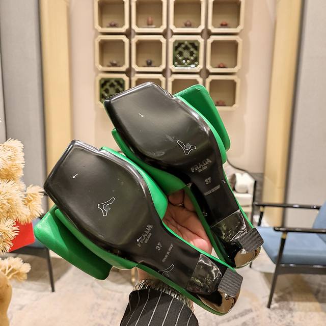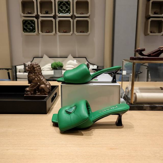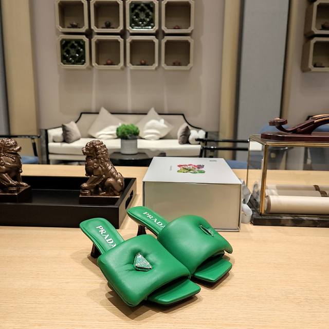 马卡龙系列 顶级包装配套最高版本 PRADA 2024普拉达春季 最新款且超级爆系列填充羽绒矮跟凉爆品。 顶级原版区分:看原版粗鞋跟以及填充绒的厚度。
