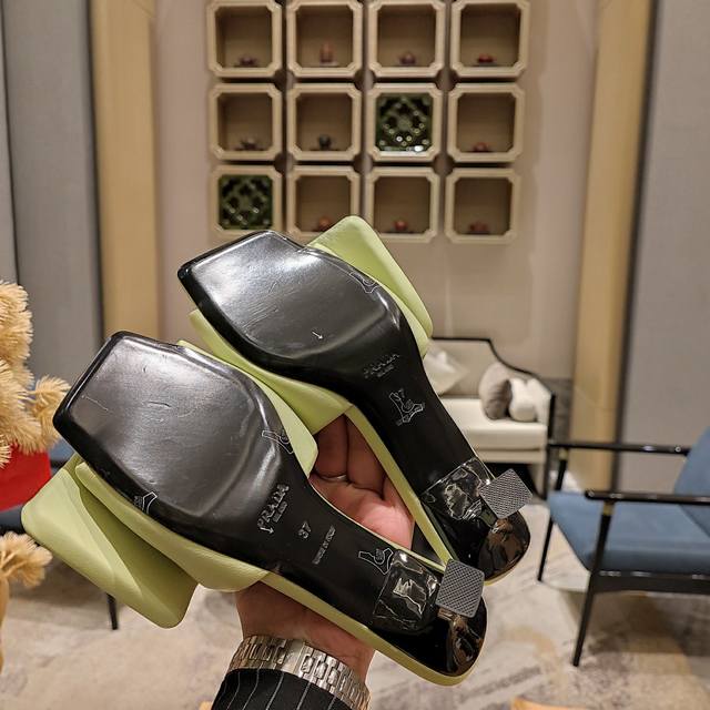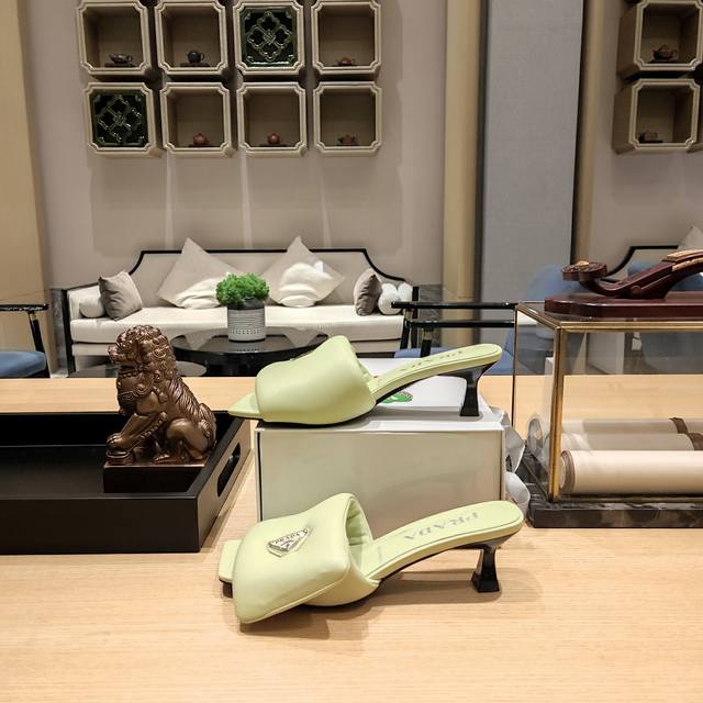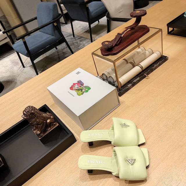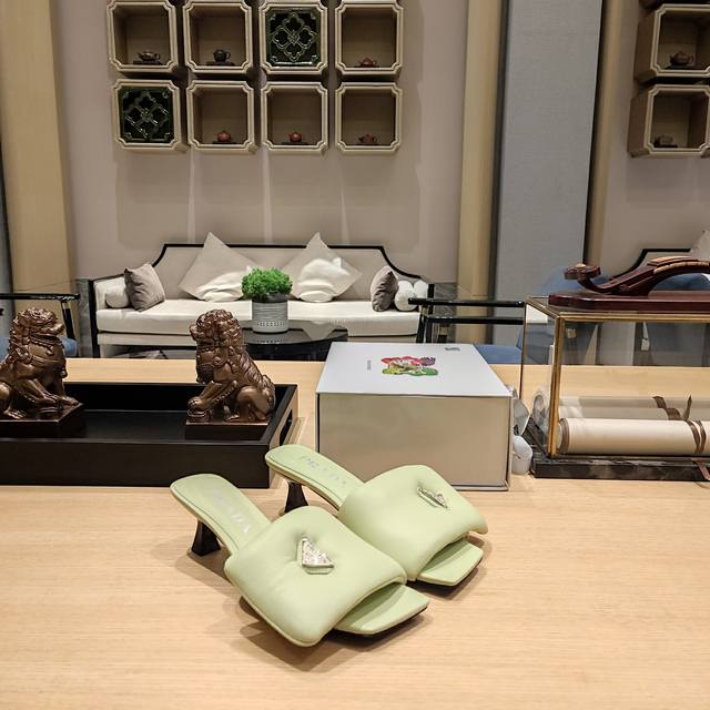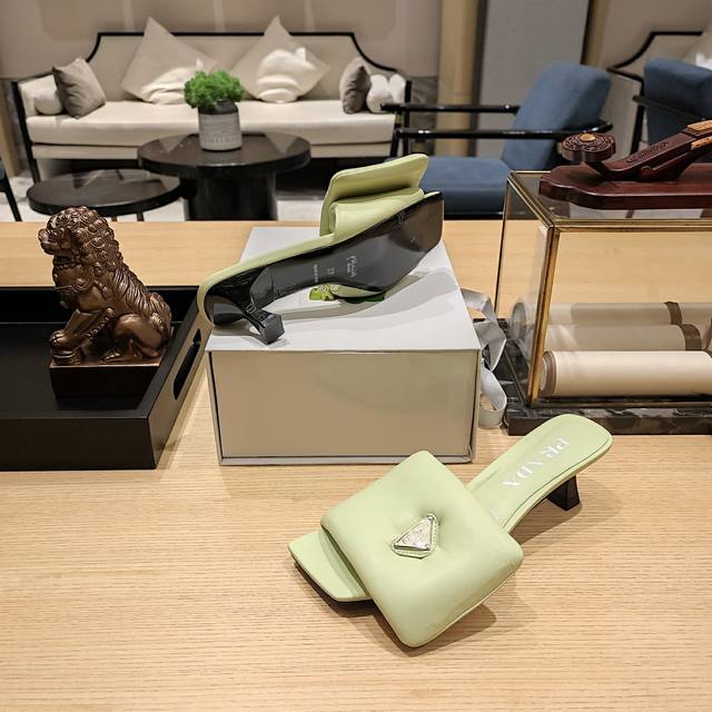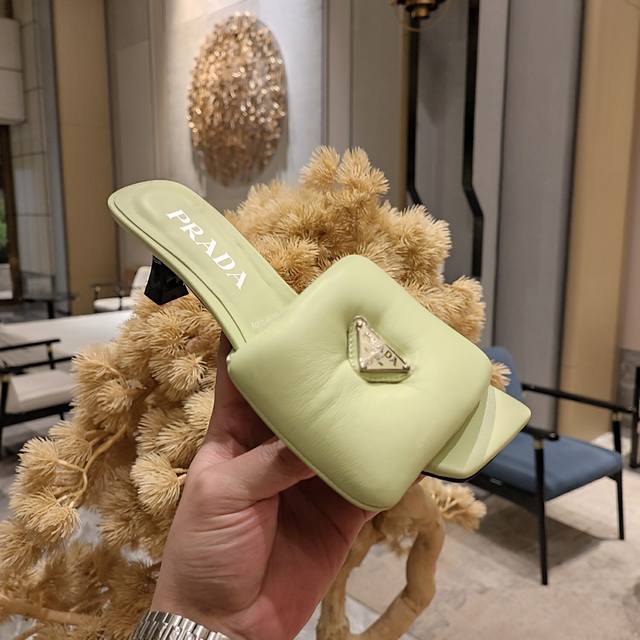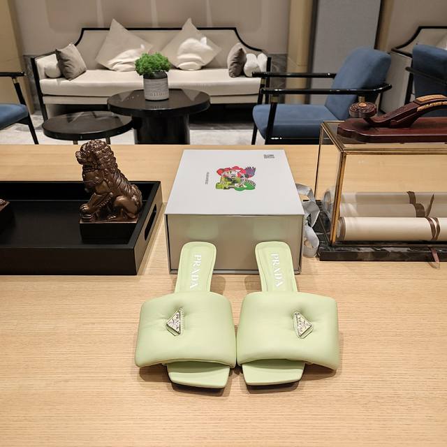 马卡龙系列 顶级包装配套最高版本 PRADA 2024普拉达春季 最新款且超级爆系列填充羽绒矮跟凉爆品。 顶级原版区分:看原版粗鞋跟以及填充绒的厚度。