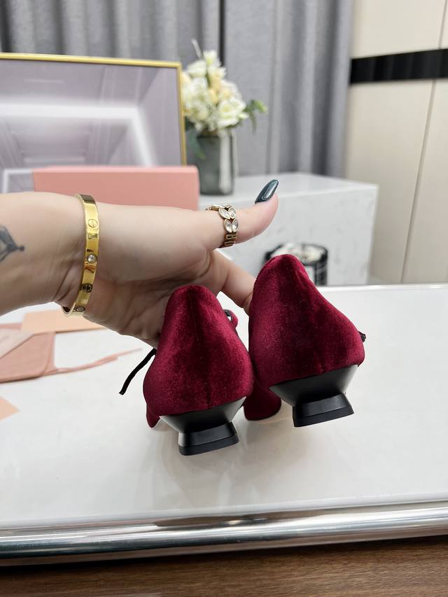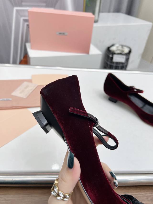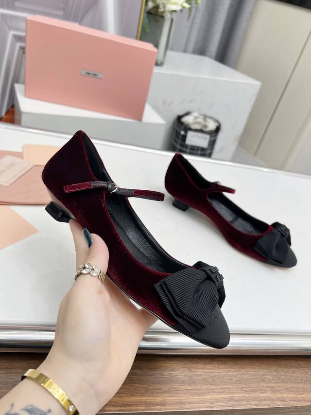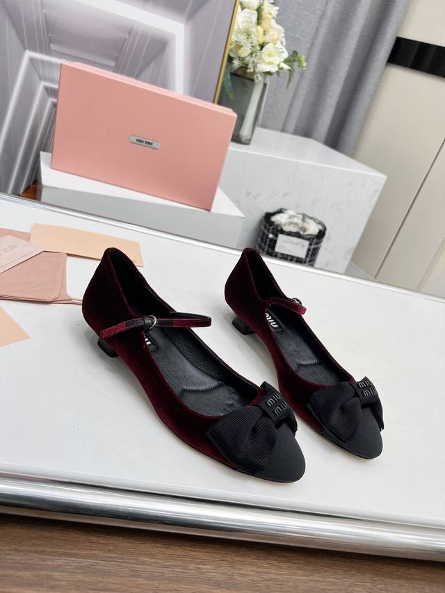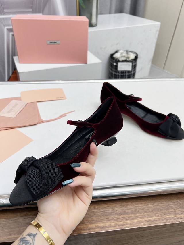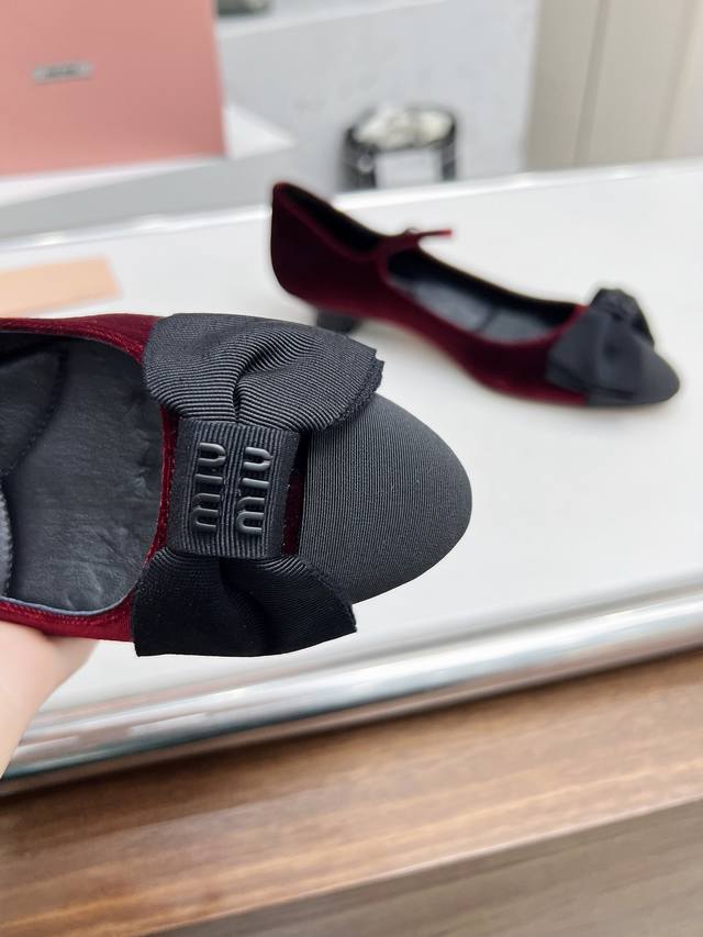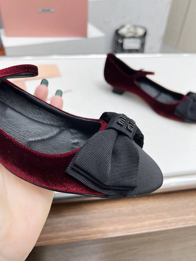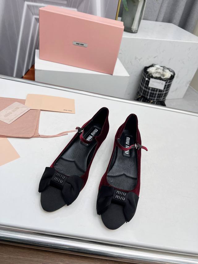 MiuMiu2024早春新款 蝴蝶结玛丽珍鞋超级百搭,这次买了好多新鞋子,鞋身是绒面,鞋头是黑色蝴蝶结,超级心水的富家千金本金