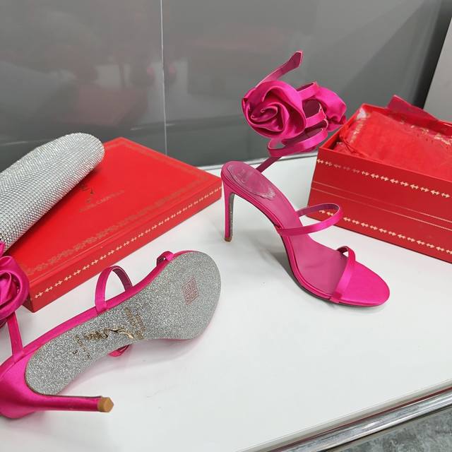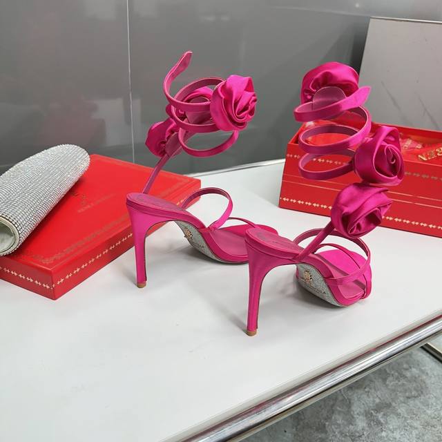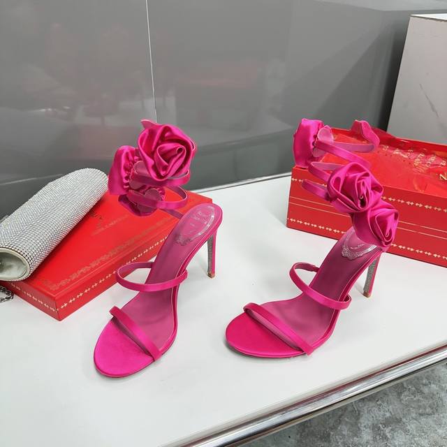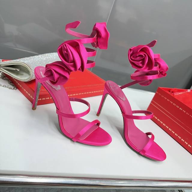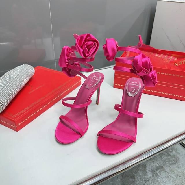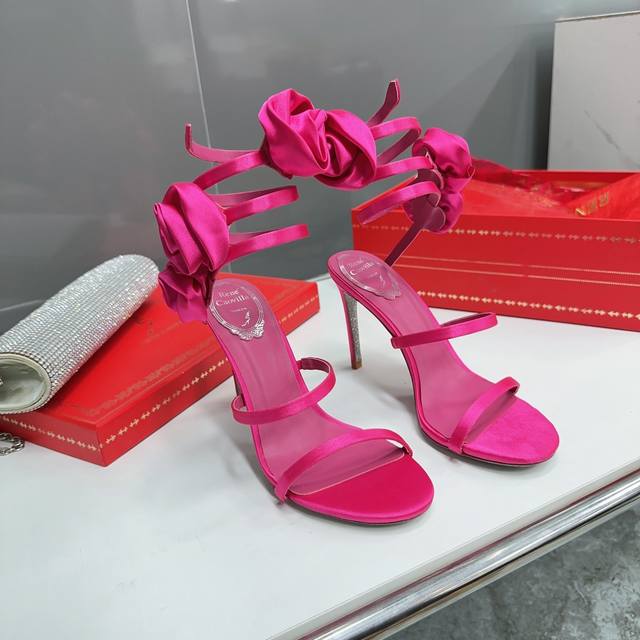 高品质 ! 芮妮乔薇拉 RC FLORIANE系列,原版做货蛇形缠绕玫瑰花朵高跟婚鞋女士凉鞋,螺旋系带上装饰丝绸花朵,将浪漫和感性的态度融合一体,让梦幻鞋履增加柔情独特的美感鞋面:进口真丝