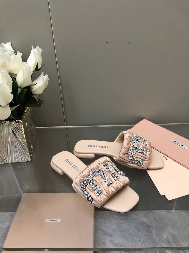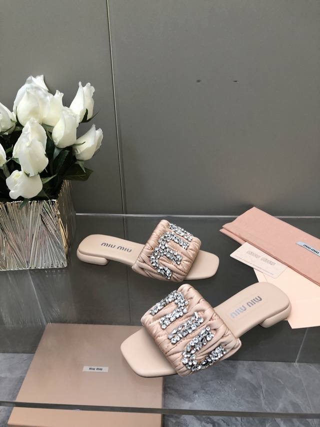 2025-水台款 真皮大底款 Miu Mi*2025春夏新品重工满钻拖鞋百搭时髦单品!集低调奢华的一字潮拖~随意搭配怎么穿都好看