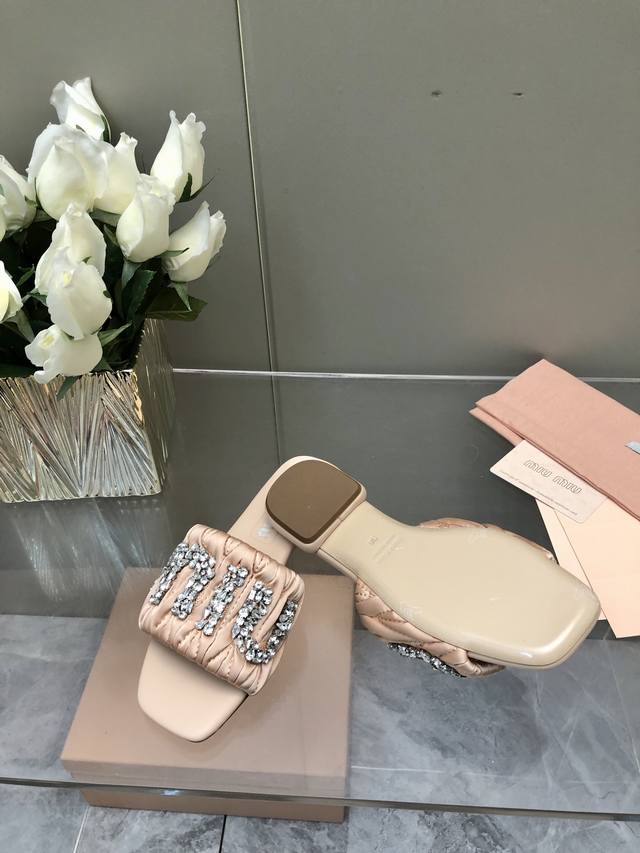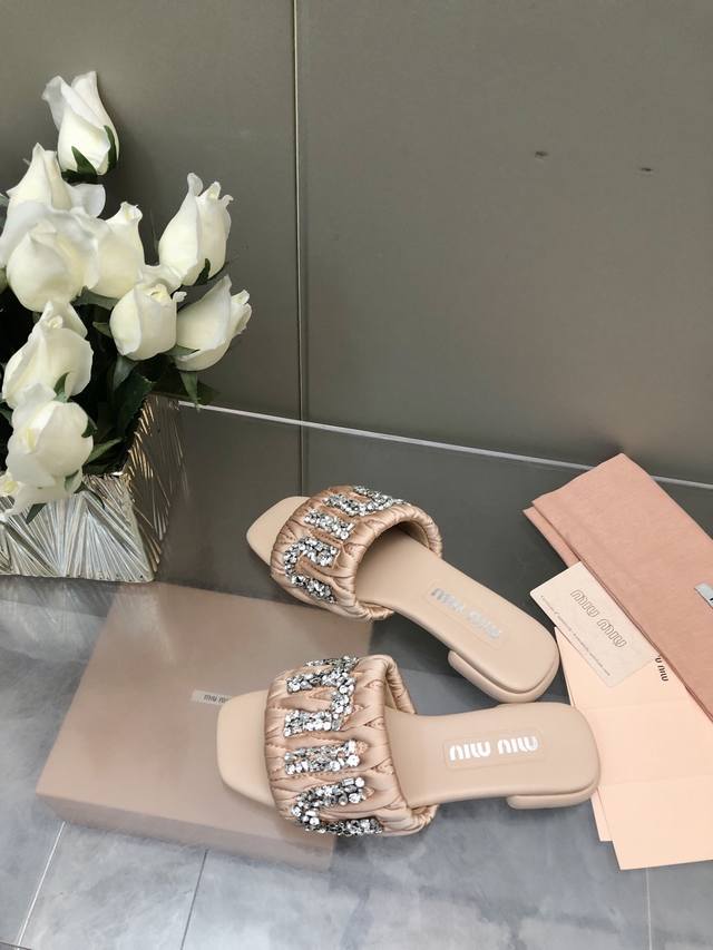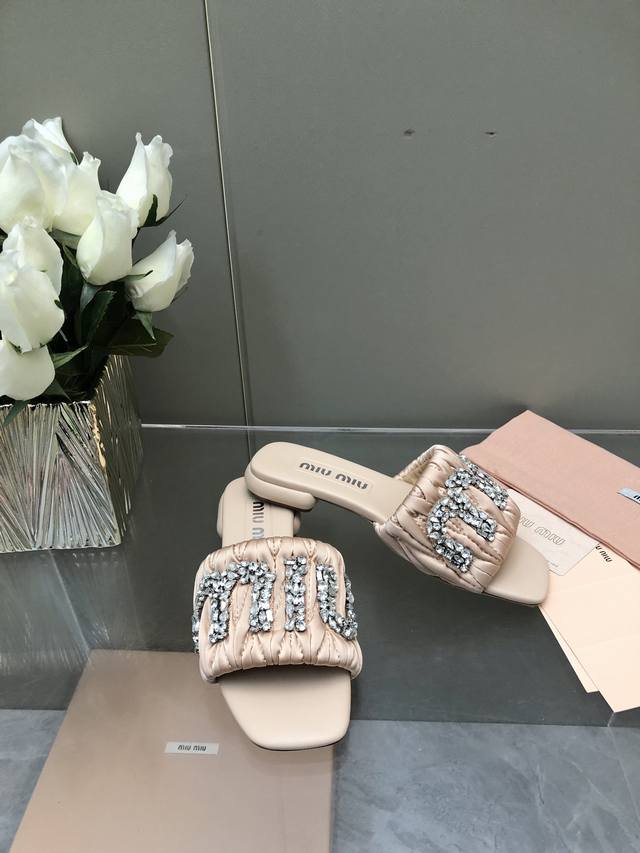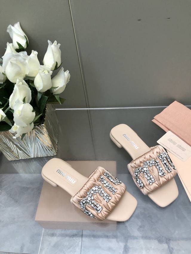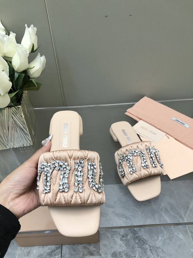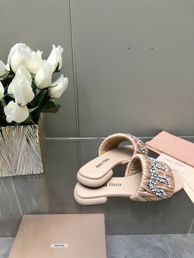 / 2025-水台款 真皮大底款 Miu Mi*2025春夏新品重工满钻拖鞋百搭时髦单品!集低调奢华的一字潮拖~随意搭配怎么穿都好看鞋面 内里 垫脚 进口真丝 羊皮