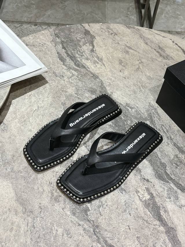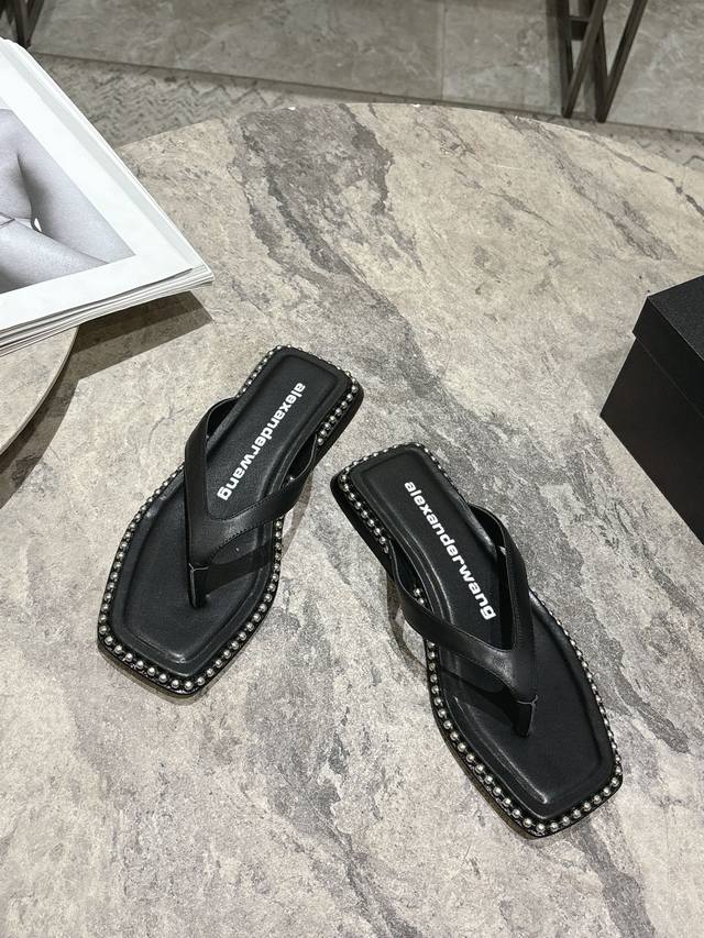 / Alexander Wang 25春夏大王高品质平底凉拖鞋原版定制五金Logo内里垫脚原厂材质山羊皮!纯钢串珠延条配置高密度意大利进口牛皮大底!鞋面牛皮 铆钉设