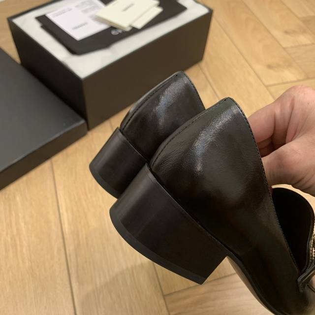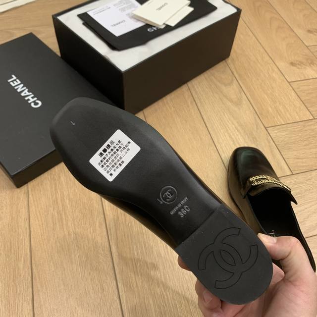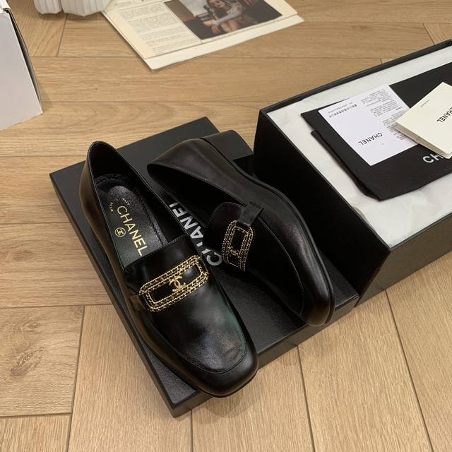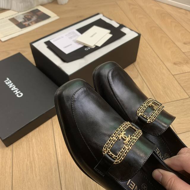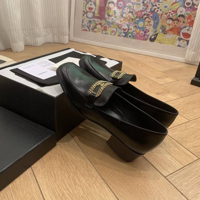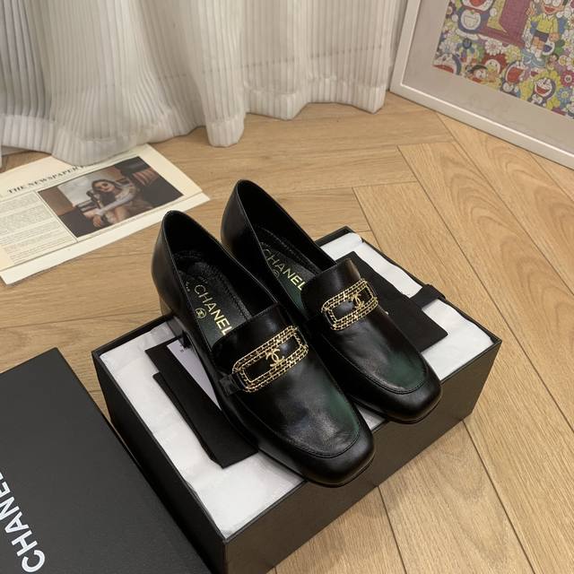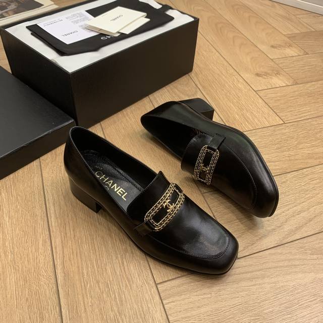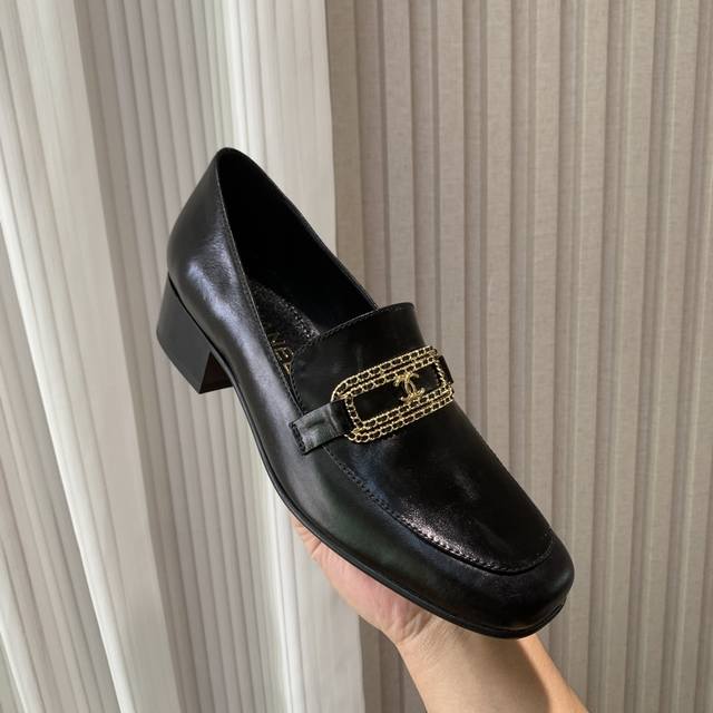 链条字母扣方头粗跟乐福鞋