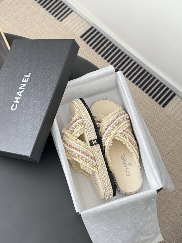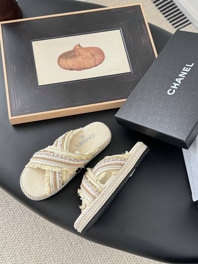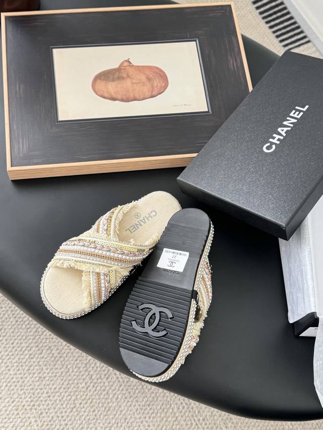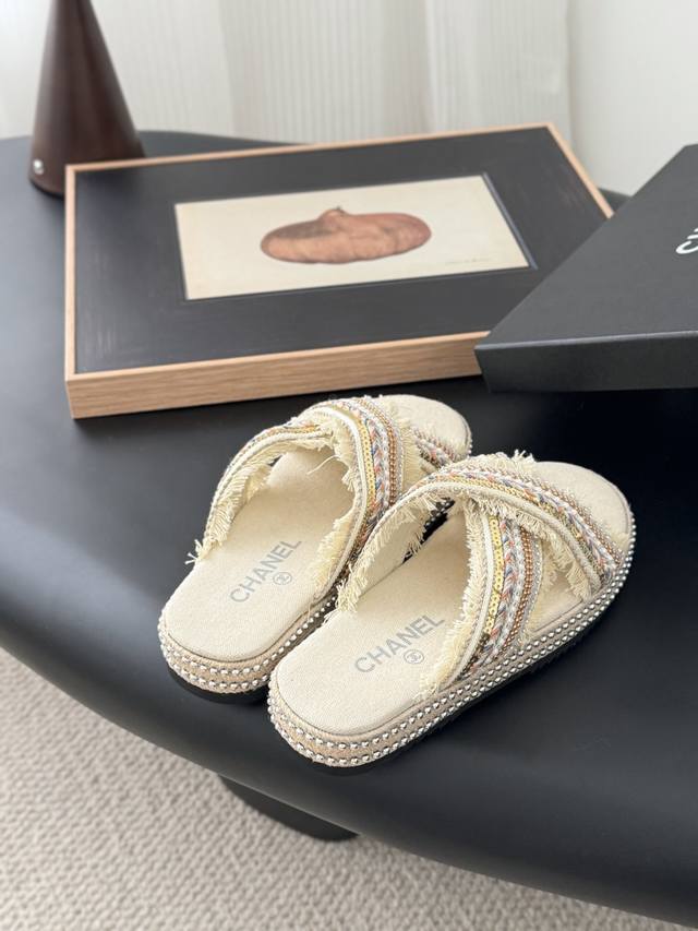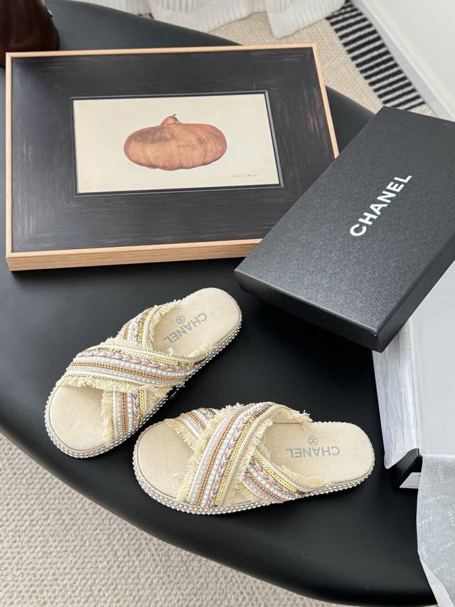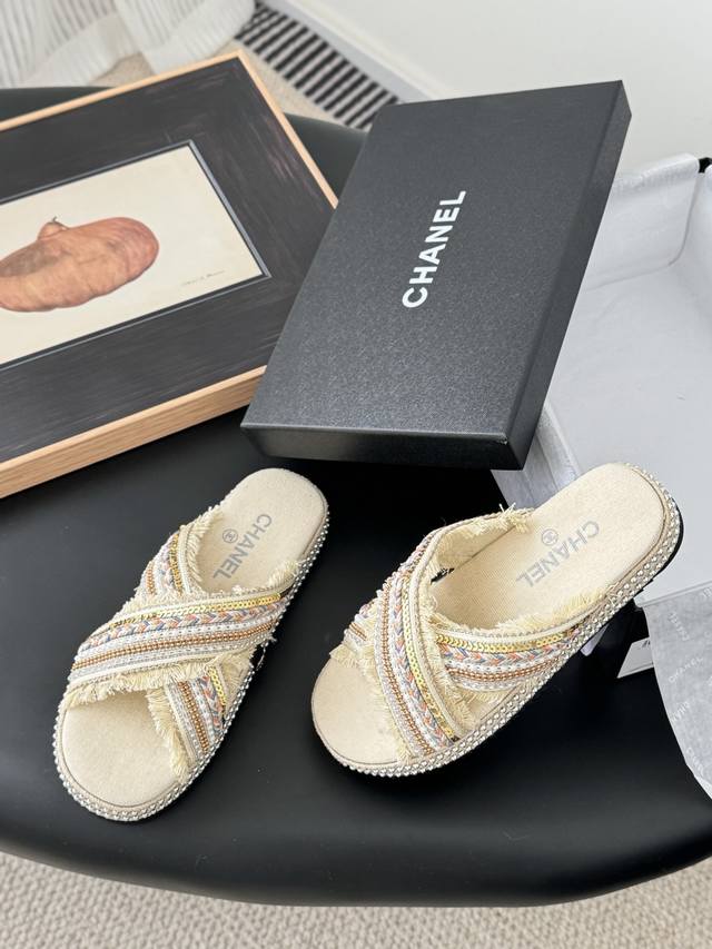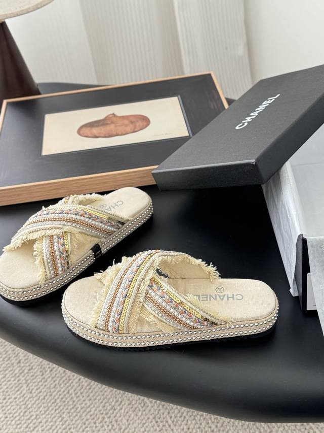 Chanel 24P新款交叉拖鞋上脚很舒服 适合日常通勤鞋面采用妮布 非常柔软Size:35-39 其他码数定