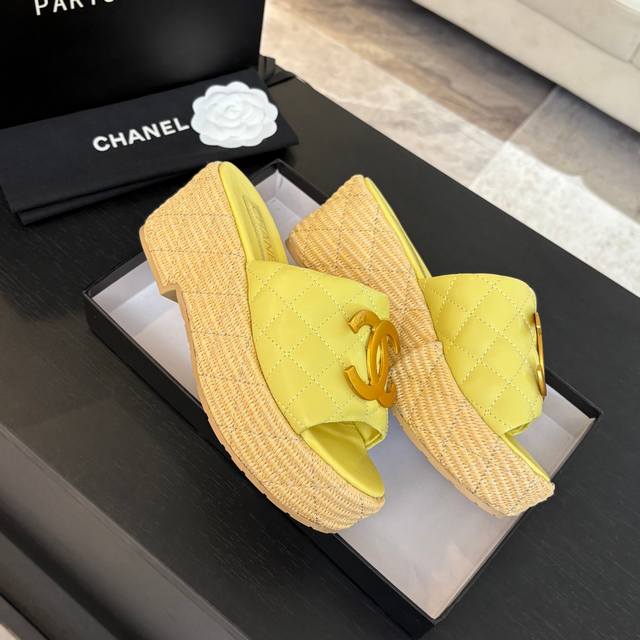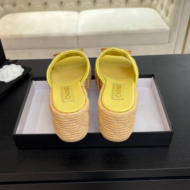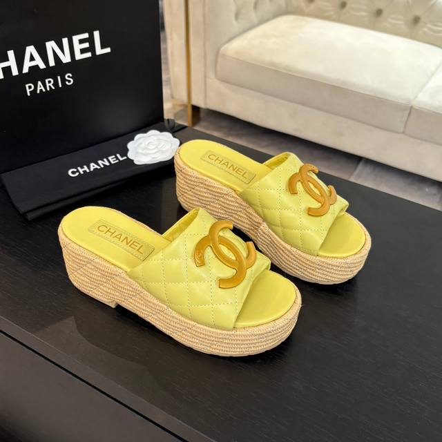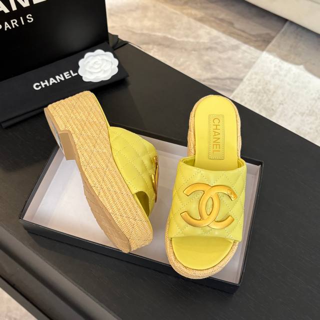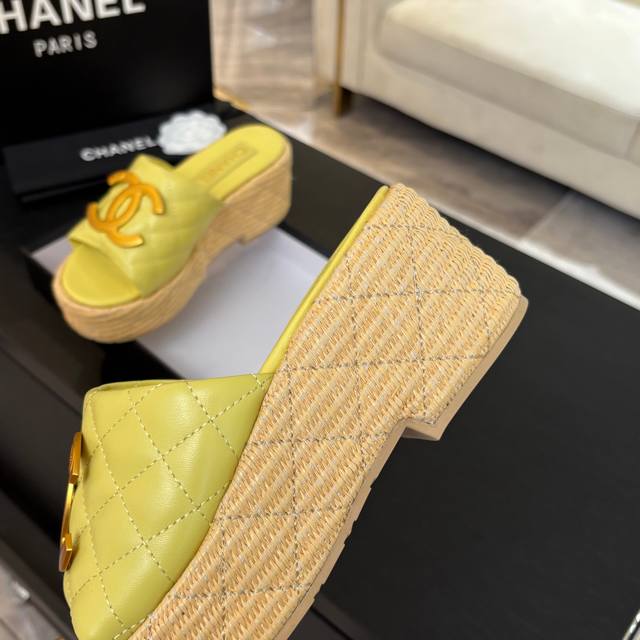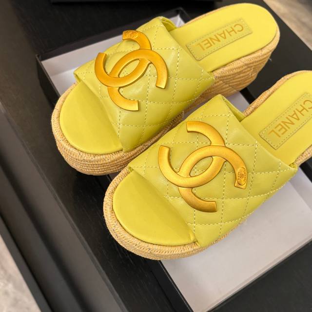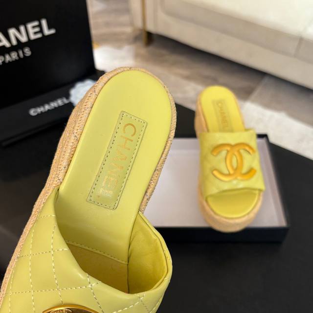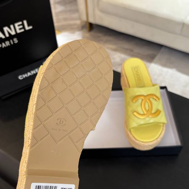 Chanel 25C早春度假系列拖鞋这是甜心芭比的一季又要让多少香奶奶女孩少女心泛滥让人眼前一亮的感觉经典的大标设计 鞋面定制面料鞋面牛皮 内里羊皮 Size: