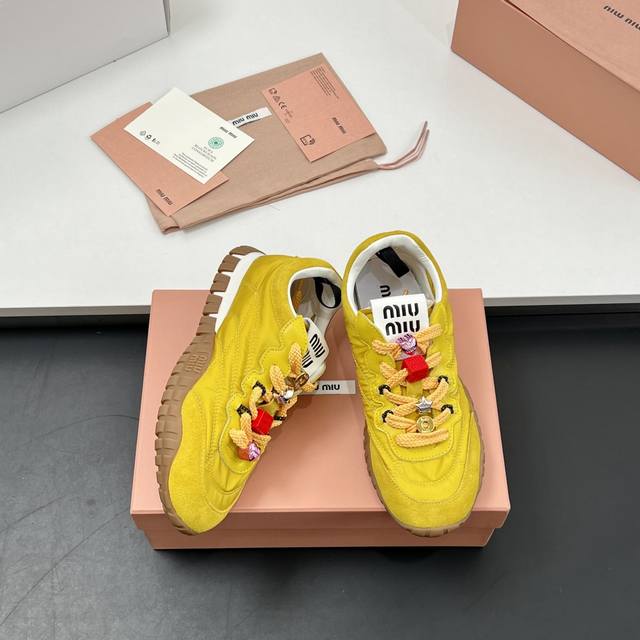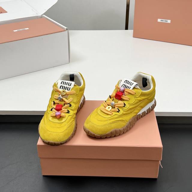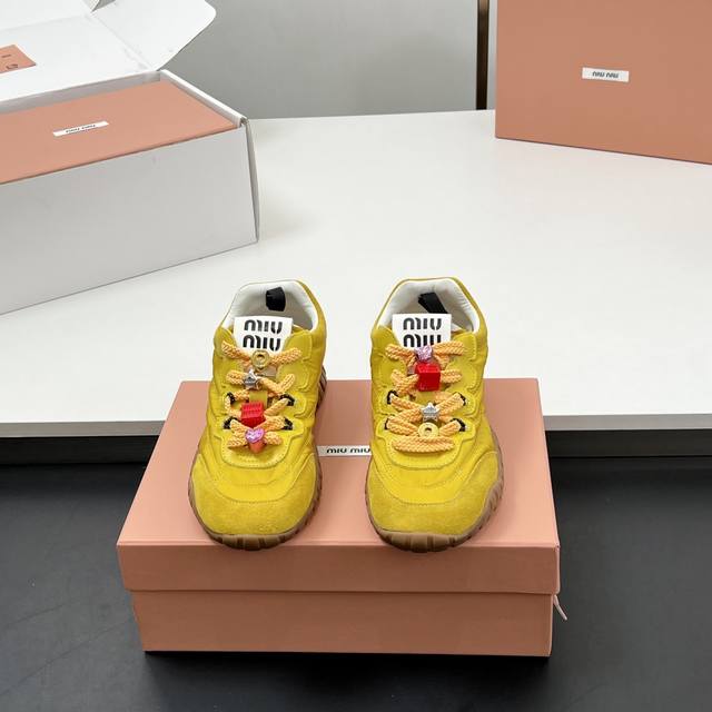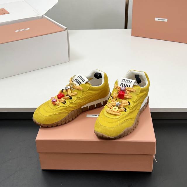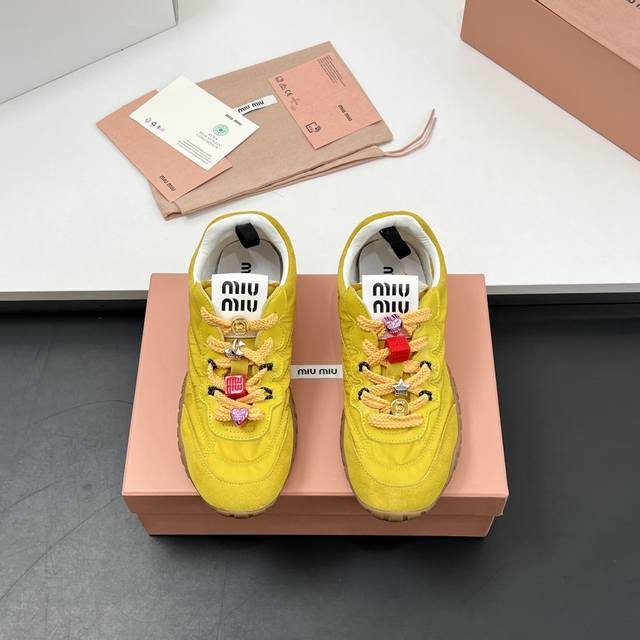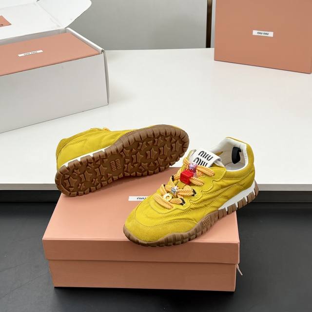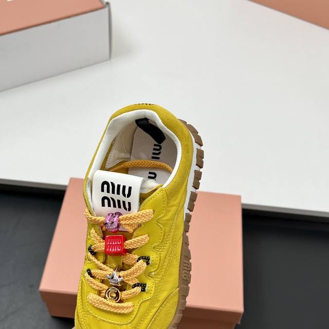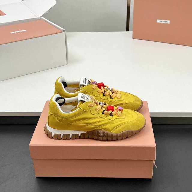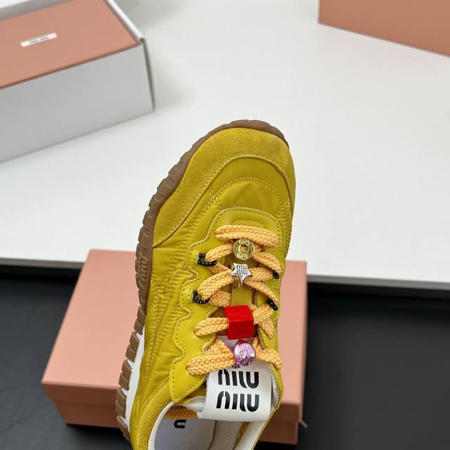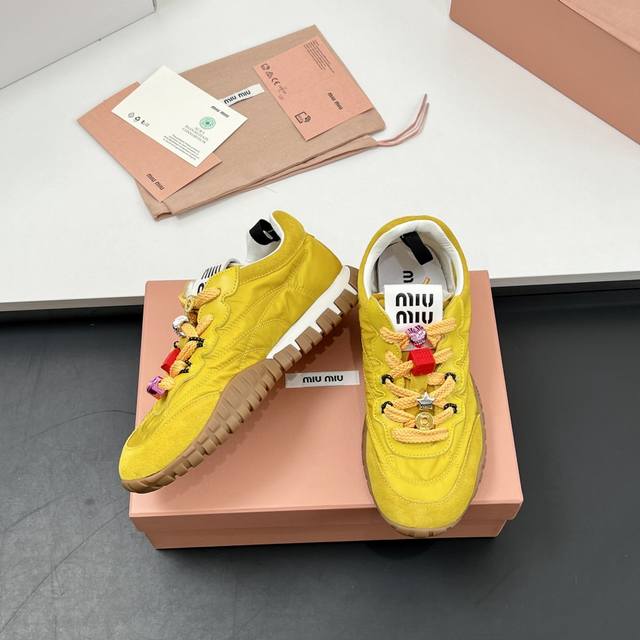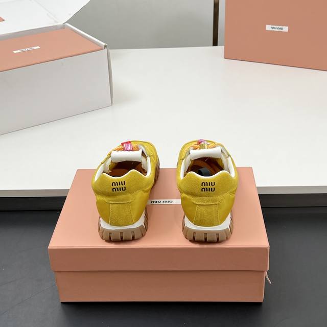 高版本!Miu Miu 缪缪Tyre系带休闲运动鞋、 系带老爹鞋 魔术贴玛丽珍芭蕾舞鞋。配色选项包括芥末黄、灰色、奶油色和橄榄绿。自带十足踩踏感的 Tyre 隶属于 Miu Miu SS25 Prelude 系列,也是近段时间 Miu Miu 运动鞋产品辉煌的化身。Miu Miu 今年在塑造鞋履产品层面不遗余力,不禁让人愈发期待其未来表现。
