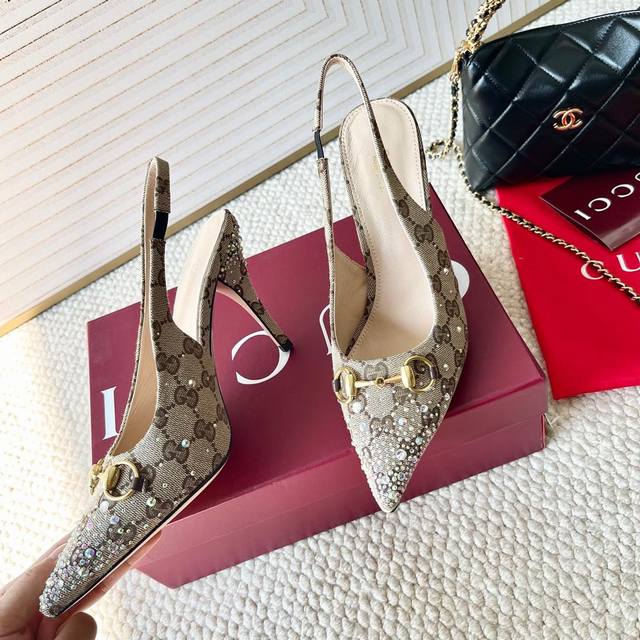 Gucci古奇25年早春新款GG家马衔扣提花烫钻尖头高跟凉鞋