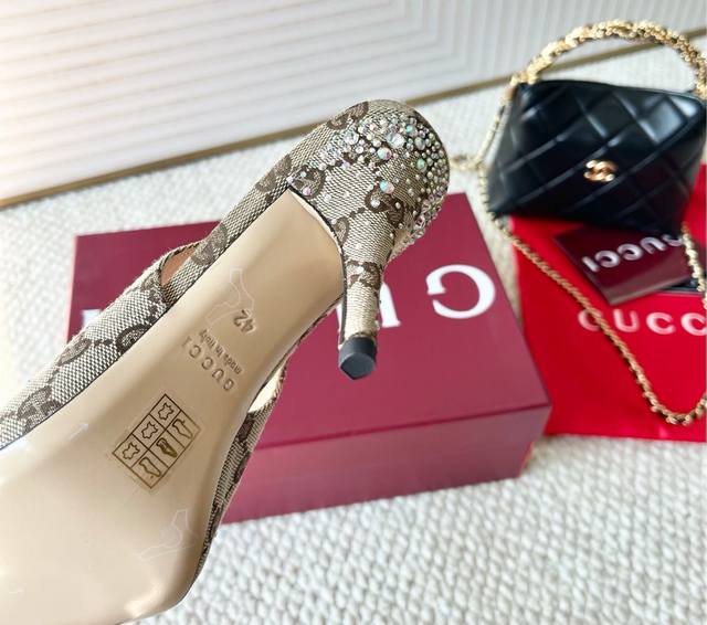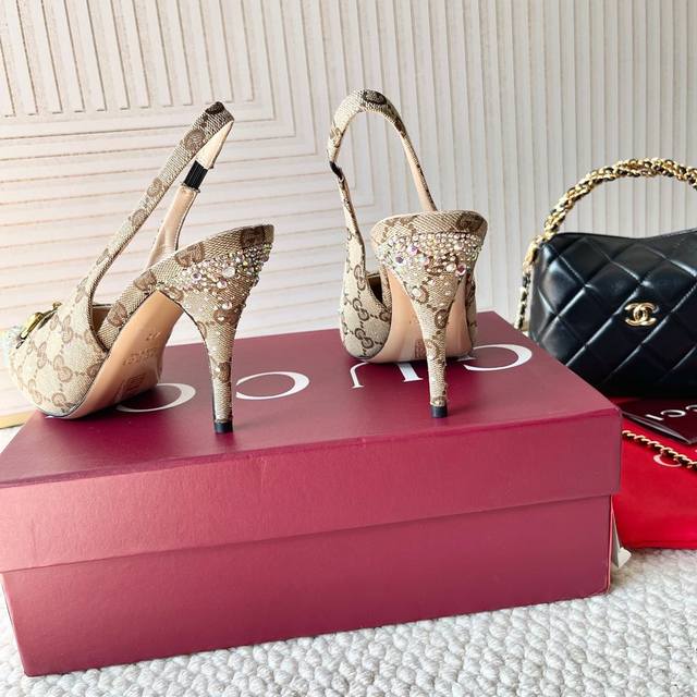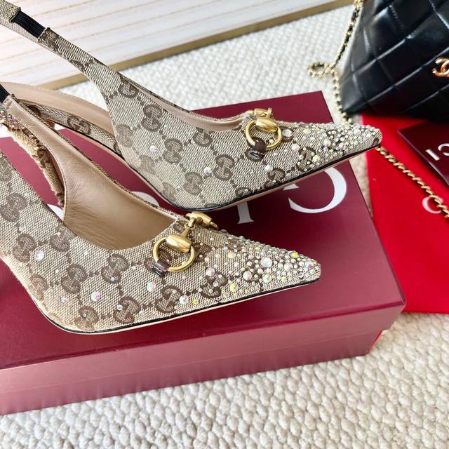Gucci古奇25年早春新款GG家马衔扣提花烫钻尖头高跟凉鞋老花布+真皮底跟高:10cm 4cm正码:35-39订做34.40.41.42