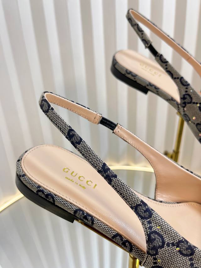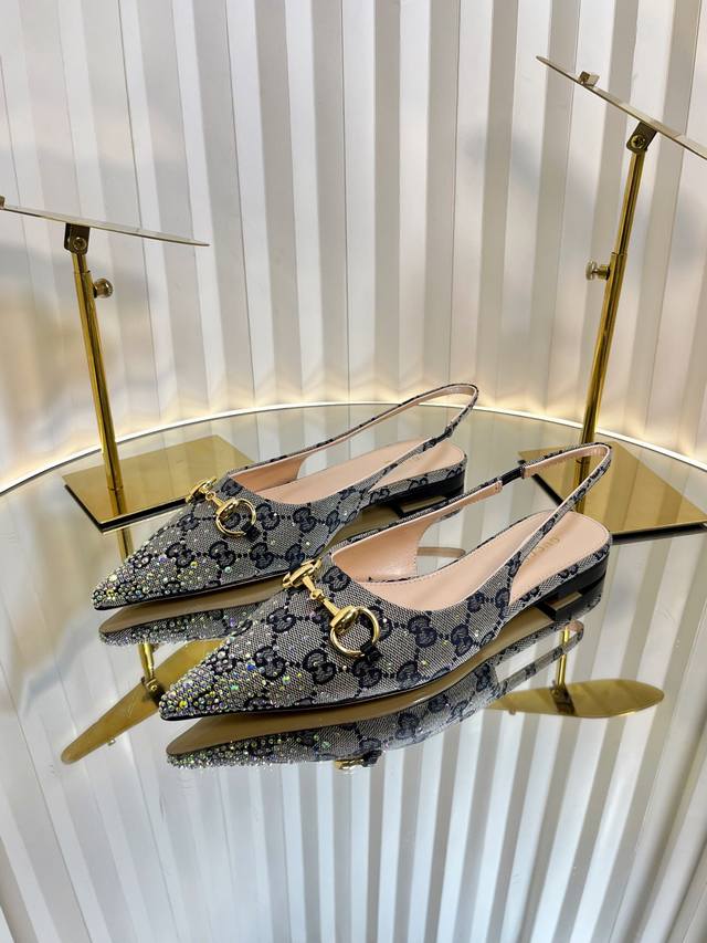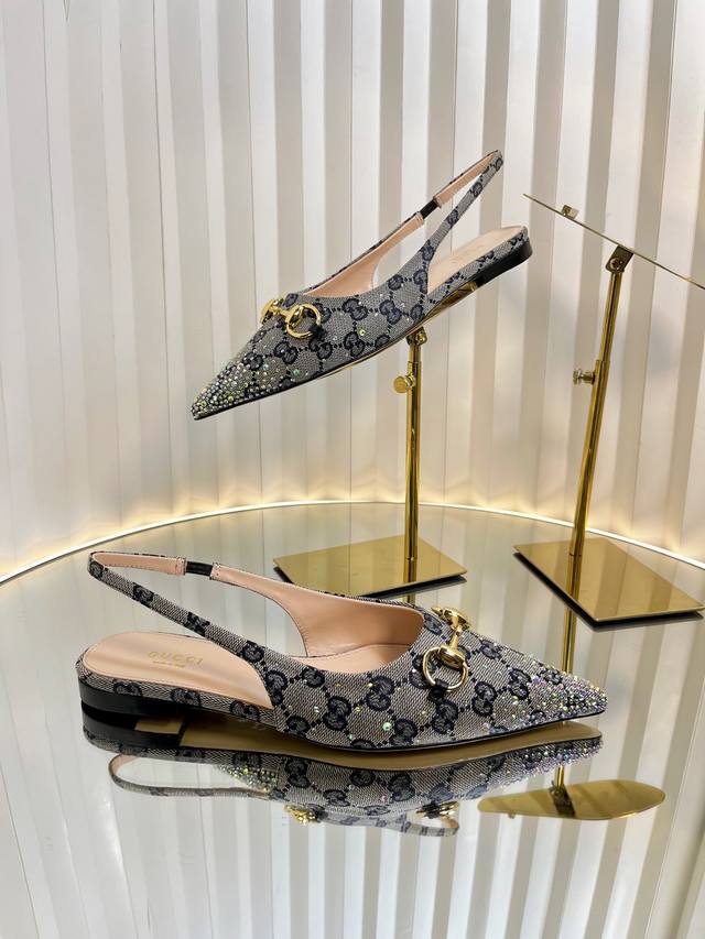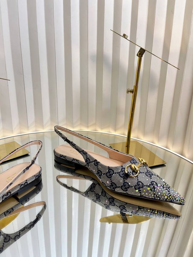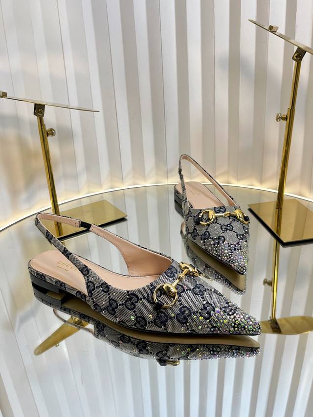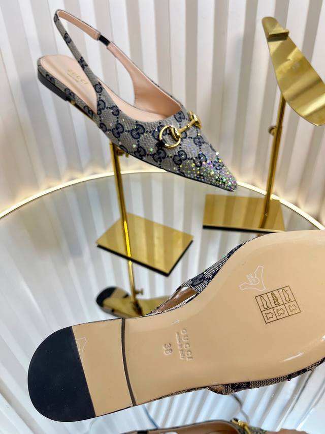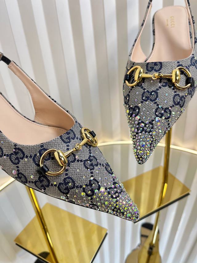 Gucci马衔扣浅口凉鞋高跟鞋这款鞋履精心点缀璀璨夺目的多刻面水晶,为经典款式注入别样风情。标志性字母图案帆布添上一丝隽永优雅韵味,致敬品牌的不朽传承。这款设计经过精心制作,奢华之余不失张扬前卫,尽情表达个性主张。烫钻工艺