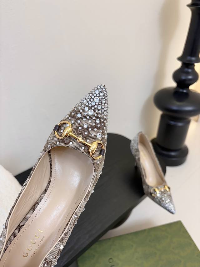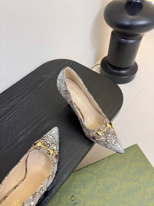 Gucci 古驰系列高跟女鞋原版1:1开发,精心调制的鞋楦,皮料 特殊材料按原版开发.扣件细腻到无可挑剔! 鞋面:品牌字母布料 烫钻内里:羊皮 大底:真皮大底跟