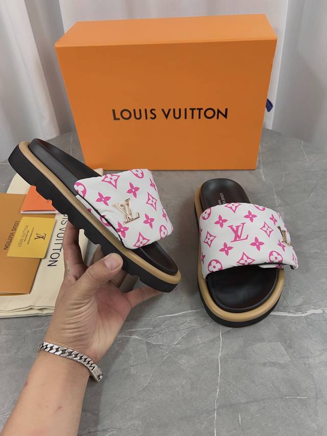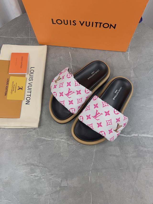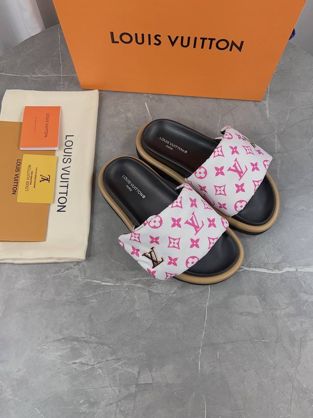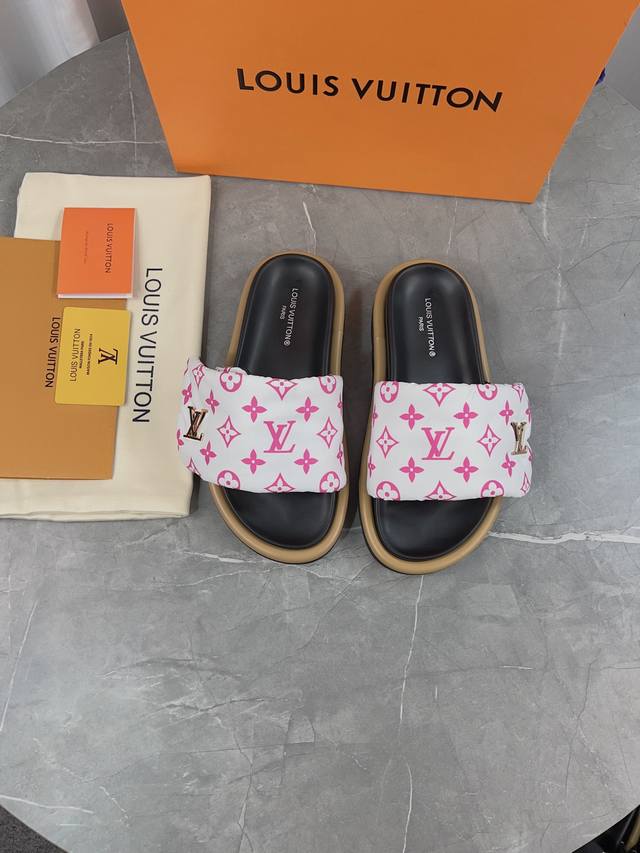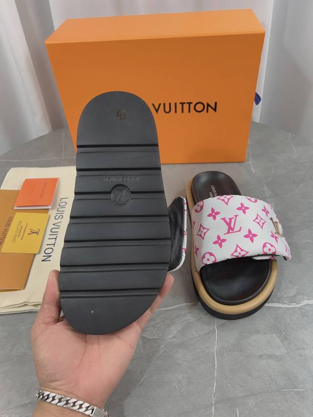 LV驴牌L家 爆款 浮雕logo 压花 凉拖鞋 本款 Pool Pillow Comfort 平底凉拖取材科技织物,以高频压印技术重绎 Monogram 图案。柔软加垫鞋面搭配可调节魔术贴,舒适韧性鞋垫再添和谐色彩 面料: 原版定制科技织物 内里:柔软羊皮里 鞋底:原版开模橡胶发泡大底 Size: 35-45批: